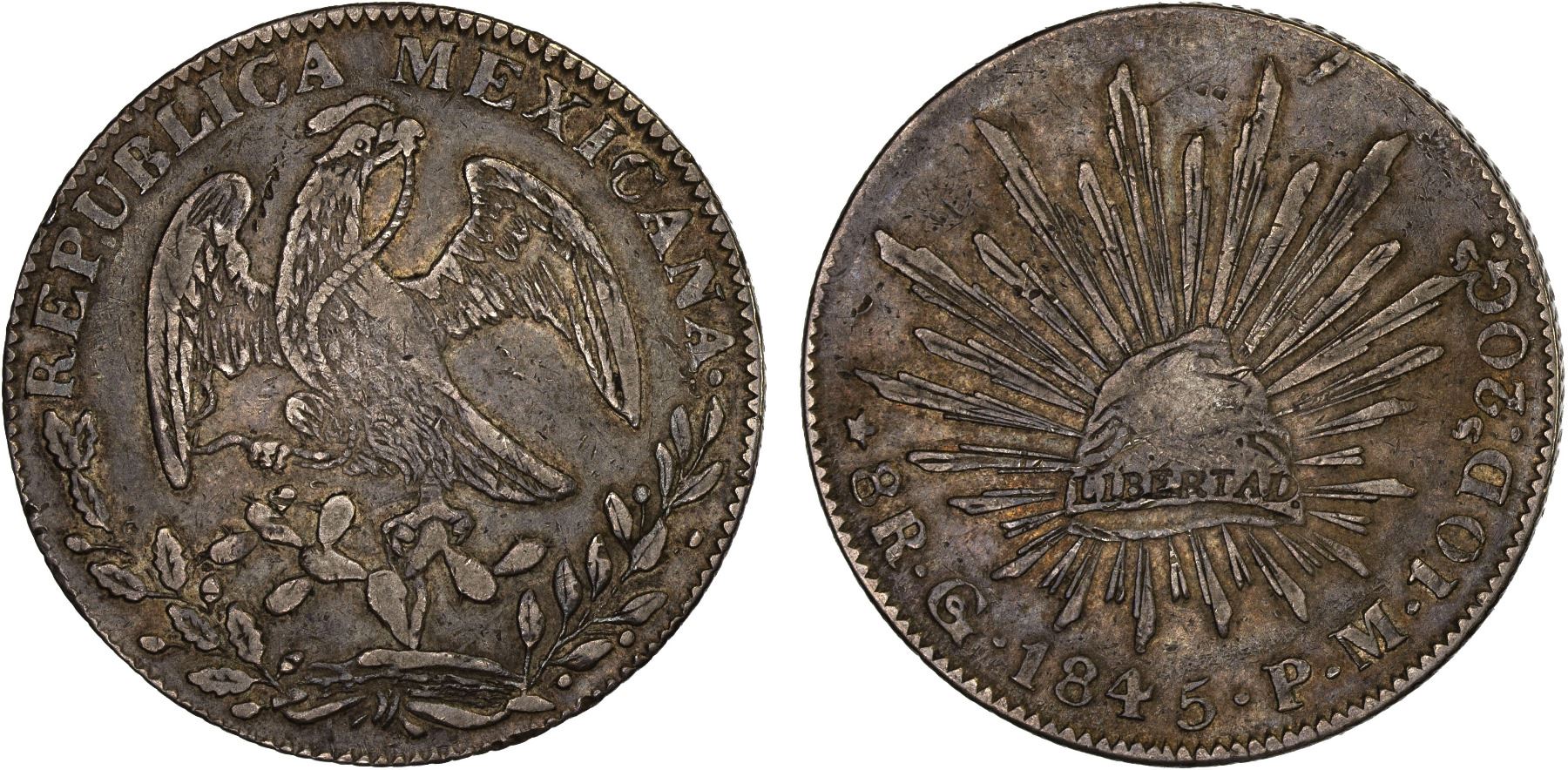 MEXICO: Republic, AR 8 reales (26.86g), Guanajuato, 1845-Go, KM-377.8, D&P-Go28, assayer PM, low 5 and wide date, cap #2 from 1844, eagle #4 from 1845, Choice VF, ex Bob "Swamperbob" Gurney Collection.