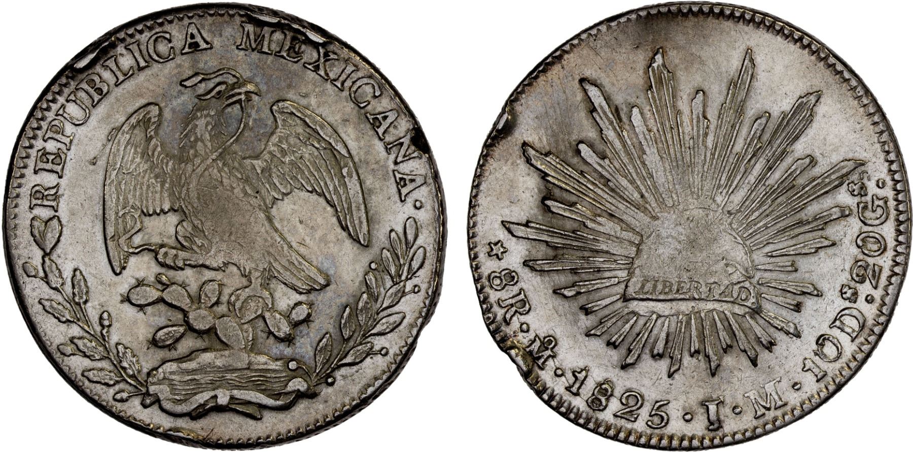 MEXICO: Republic, AR 8 reales (26.86g), Mexico City, 1825-Mo, KM-377.10, D&P-Mo04, assayer JM, several numbers and letters in date and reverse legend recut, rare variety unlisted in D&P, rim nicks, perhaps very lightly cleaned, popular date, XF, ex Bob "Swamperbob" Gurney Collection.