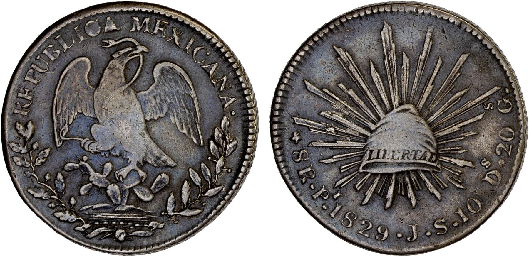 MEXICO: Republic, AR 8 reales (26.86g), San Luis Potosi, 1829-Pi, KM-377.12, D&P-Pi04, assayer JS, squared base on eagle's tail, deep tone, scarce date/assayer, VF, ex Bob "Swamperbob" Gurney Collection. Only one example of this variant has been seen by the consignor with tail cut 35-40 degrees to the axis.