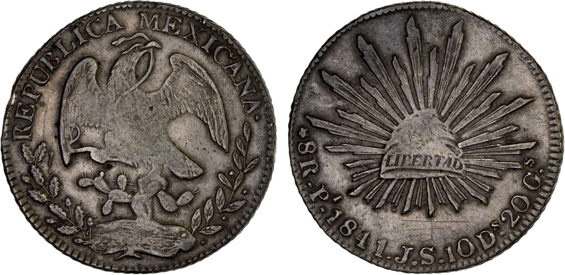 MEXICO: Republic, AR 8 reales (26.86g), San Luis Potosi, 1841-Pi, KM-377.12, D&P-Pi16, assayer JS, normal eagle, ray matrix pattern #1, long ray 25 after star, light reverse scratches, small obverse rim nick, toned, scarce date/assayer, VF-XF, ex Bob "Swamperbob" Gurney Collection.