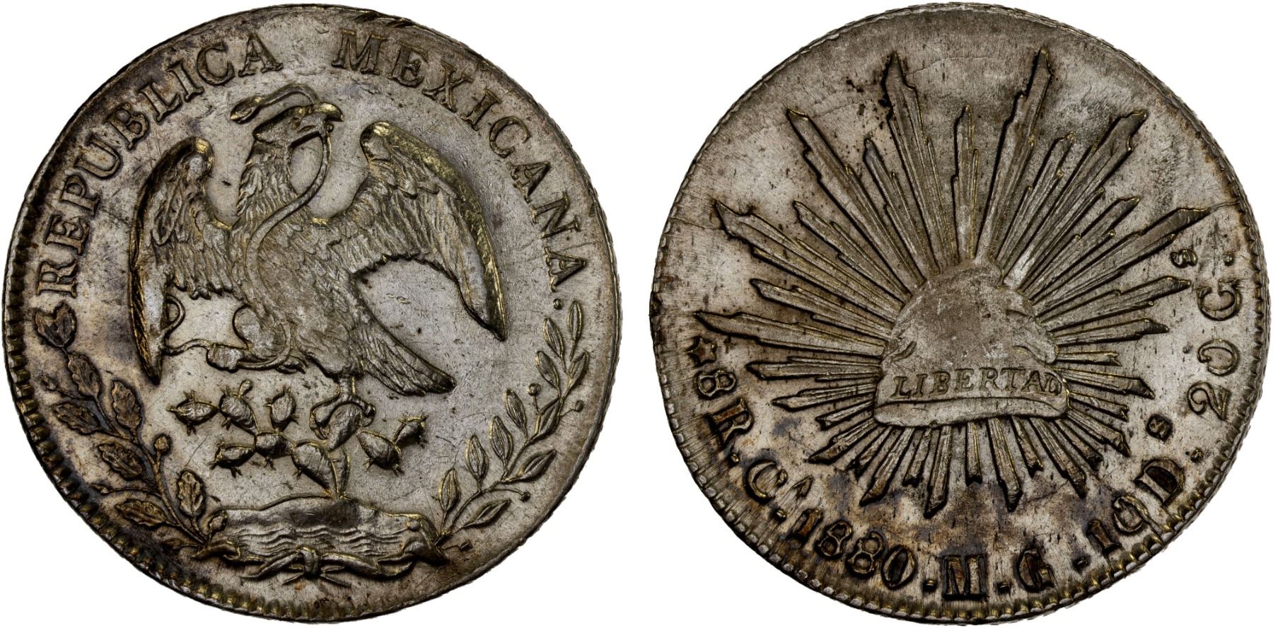 MEXICO: Republic, AR 8 reales (26.88g), 1880-Ca, KM-377.2, assayer MG, tall thin assayer's initials, oval 0 in date, a couple small obverse rim nicks, very rare in this grade, Choice XF, ex Bob "Swamperbob" Gurney Collection.