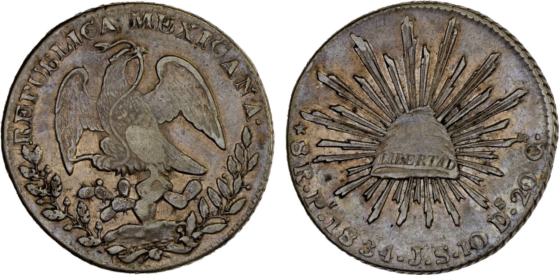 MEXICO: Republic, AR 8 reales (26.88g), San Luis Potosi, 1834-Pi, KM-377.12, D&P-Pi09, assayer JS, minor reverse spots, probably lightly cleaned at some time, light tone, long-tailed eagle, somewhat scarce date/assayer, XF, ex Bob "Swamperbob" Gurney Collection.
