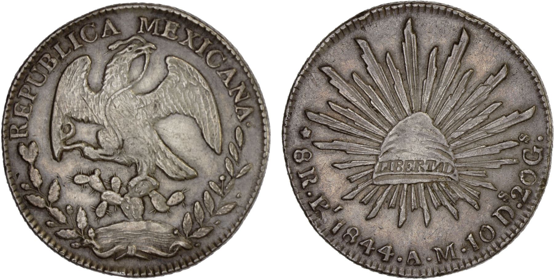 MEXICO: Republic, AR 8 reales (26.88g), San Luis Potosi, 1844-Pi, KM-377.12, D&P-Pi21, assayer AM, double struck, lightly cleaned, has retoned, scarce date/assayer, XF-AU, ex Bob "Swamperbob" Gurney Collection.