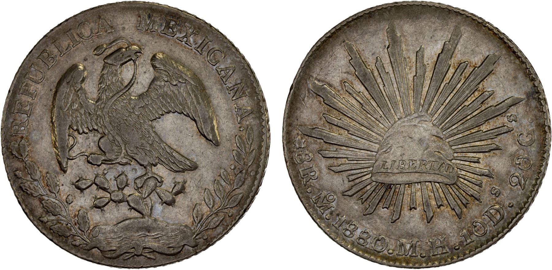 MEXICO: Republic, AR 8 reales (26.90g), 1880-Mo, KM-377.10, assayer MH, traces of luster, VF-XF, ex Bob "Swamperbob" Gurney Collection.