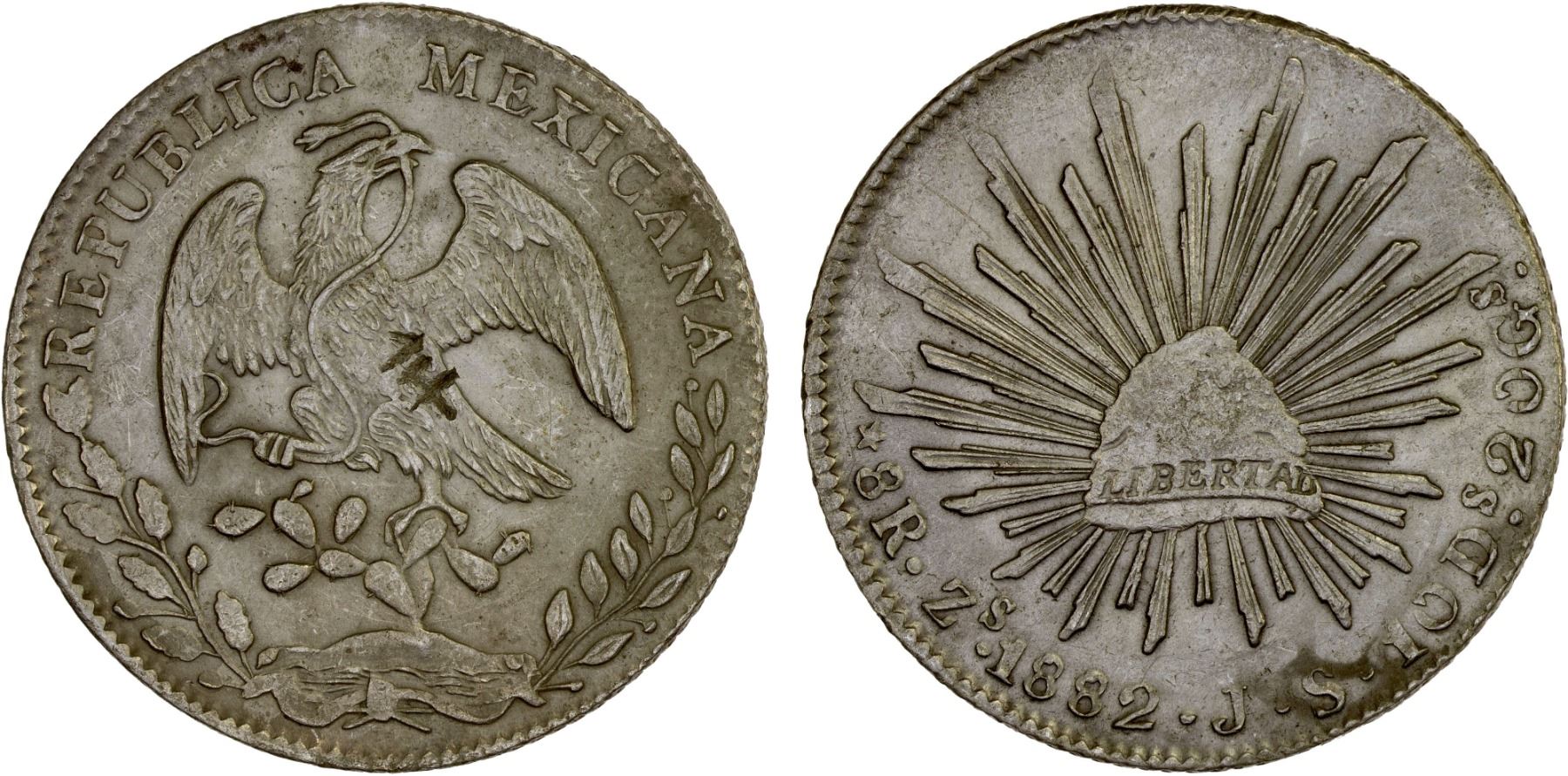 MEXICO: Republic, AR 8 reales (26.90g), 1882-Zs, KM-377.13, assayer JS, struck with reused Guanajuato dies, large S superscripts on cap die legend, Guanajuato-stype eagle and snake, one large Chinese merchant chopmark on obverse, very rare per D&P, XF-AU, ex Bob "Swamperbob" Gurney Collection.