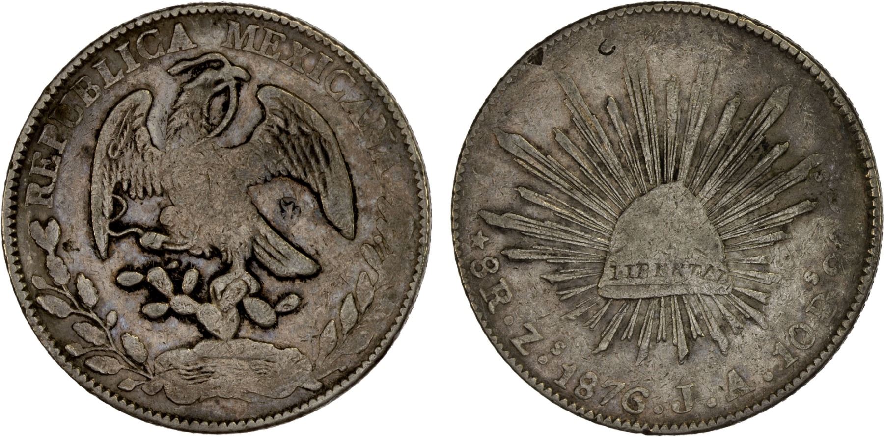 MEXICO: Republic, AR 8 reales (26.91g), 1876-Zs, KM-377.13, assayer JS, with a few small Chinese merchant chopmarks, some peripheral weakness, scarce date/mintmark/assayer, VF, ex Bob "Swamperbob" Gurney Collection.