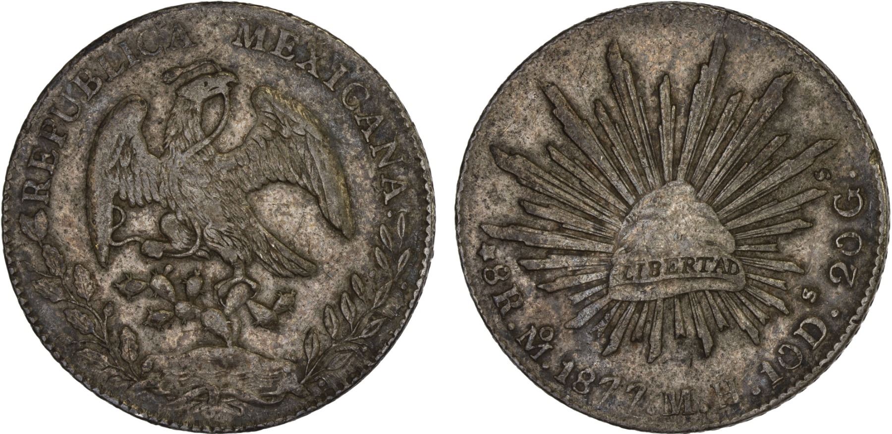 MEXICO: Republic, AR 8 reales (26.91g), 1877-Mo, KM-377.10, assayer MH, toned, tiny reverse rim nick, VF, ex Bob "Swamperbob" Gurney Collection.