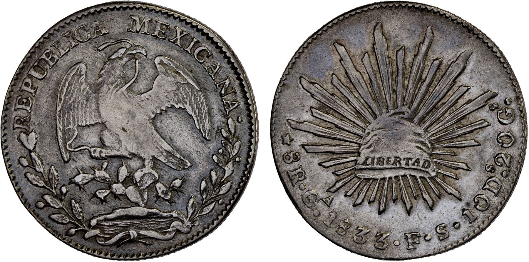 MEXICO: Republic, AR 8 reales (26.92g), Guadalajara, 1833-Ga, KM-377.6, D&P-Ga11, assayer FS, weak eagle center, lightly cleaned, scarce date/assayer, VF-XF, ex Bob "Swamperbob" Gurney Collection.