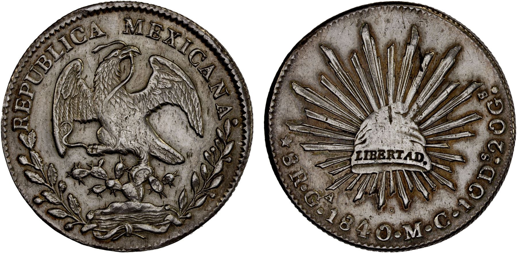 MEXICO: Republic, AR 8 reales (26.92g), Guadalajara, 1840-Ga, KM-377.6, D&P-Ga20, assayer MC, lightly cleaned, scarce date/assayer, XF, ex Bob "Swamperbob" Gurney Collection. Some of the setting dots were not polished off the reverse die.