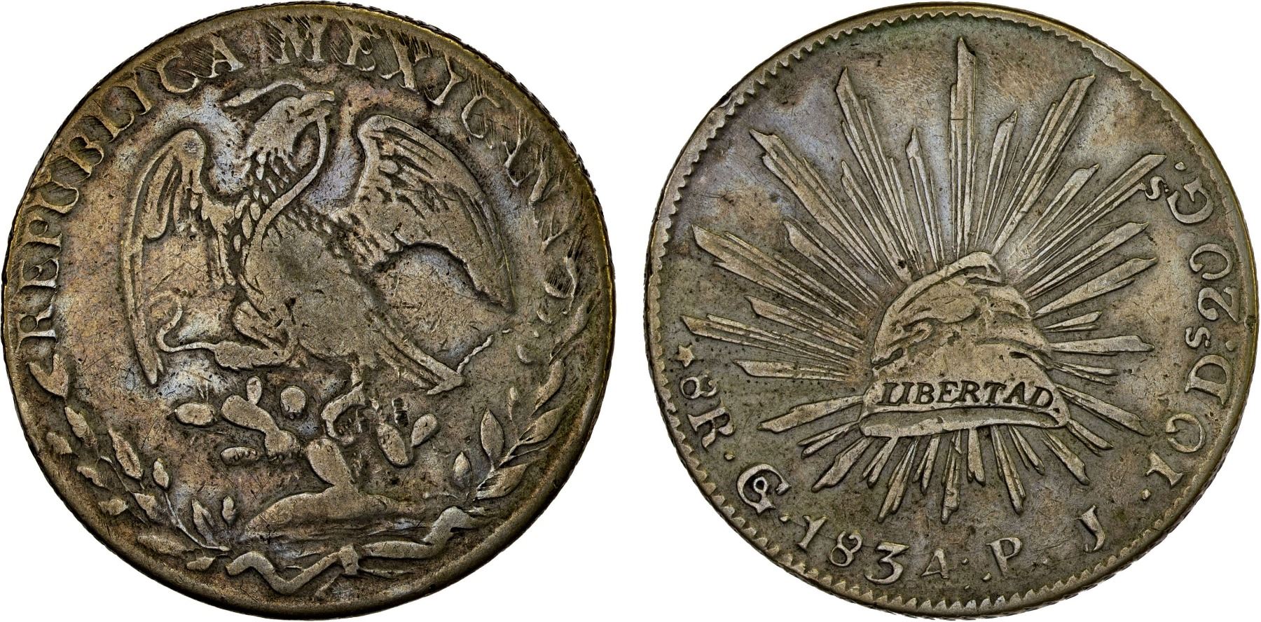 MEXICO: Republic, AR 8 reales (26.93g), 1834-Go, KM-377.8, D&P-Go16, assayer PJ, small tilted engraved 4, irregular edge, very lightly toned, F-VF, ex Bob "Swamperbob" Gurney Collection.