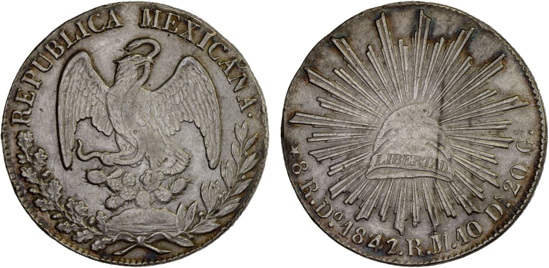 MEXICO: Republic, AR 8 reales (26.93g), 1842/1-Do, KM-377.4, D&P-Do19, assayer RM/M, 4/4/3 in date, die style of 1832-42, medal alignment, crested raptor, light peripheral tone with narrow toning streak on reverse, a few small reverse scratches, very scarce variety (unlisted), XF, ex Bob "Swamperbob" Gurney Collection.
