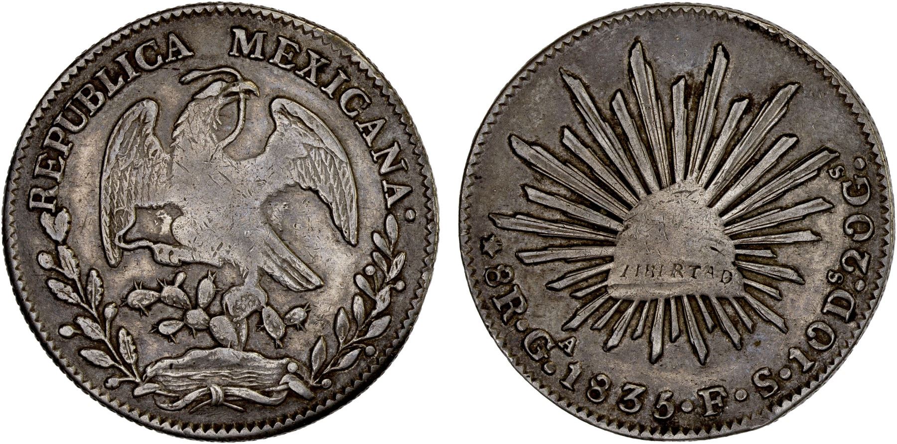 MEXICO: Republic, AR 8 reales (26.93g), Guadalajara, 1835-Ga, KM-377.6, D&P-Ga13, assayer FS, lightly cleaned, weak centers, scarce date/assayer, Choice VF, ex Bob "Swamperbob" Gurney Collection.