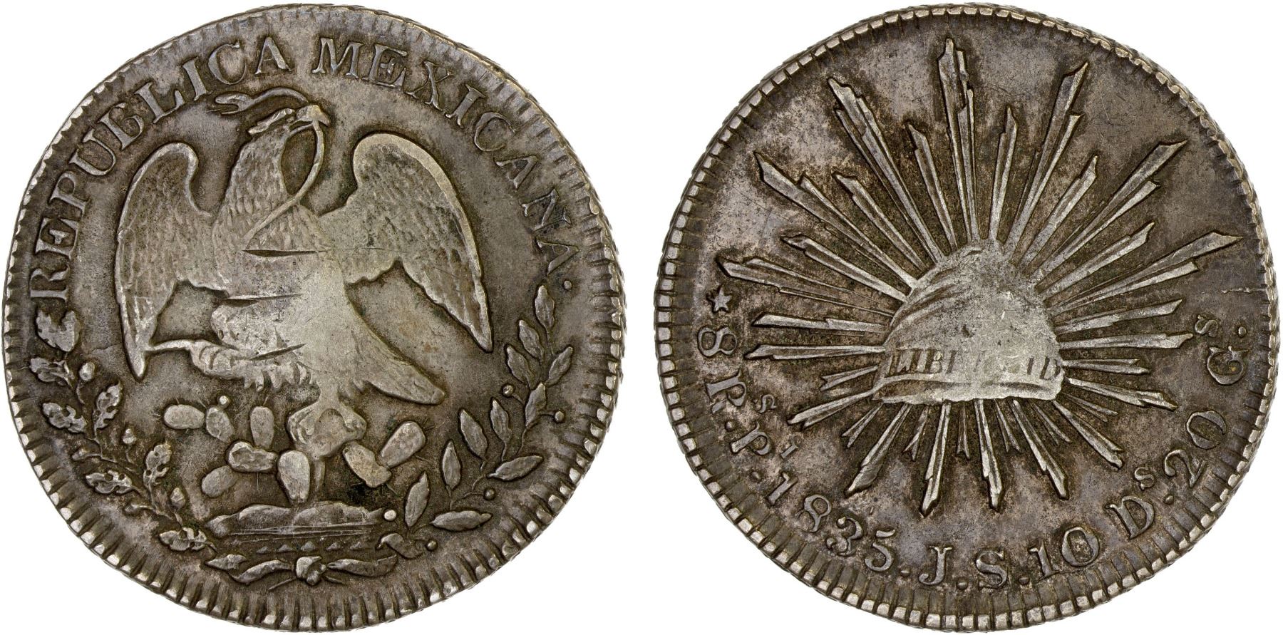 MEXICO: Republic, AR 8 reales (26.95g), San Luis Potosi, 1835-Pi, KM-377.12, D&P-Pi10, assayer JS, superscript S over 8R, variety with long-tailed eagle (transitional coin), the most scarce combination, medal alignment, scratches on eagle, somewhat scarce date/assayer, XF, ex Bob "Swamperbob" Gurney Collection.