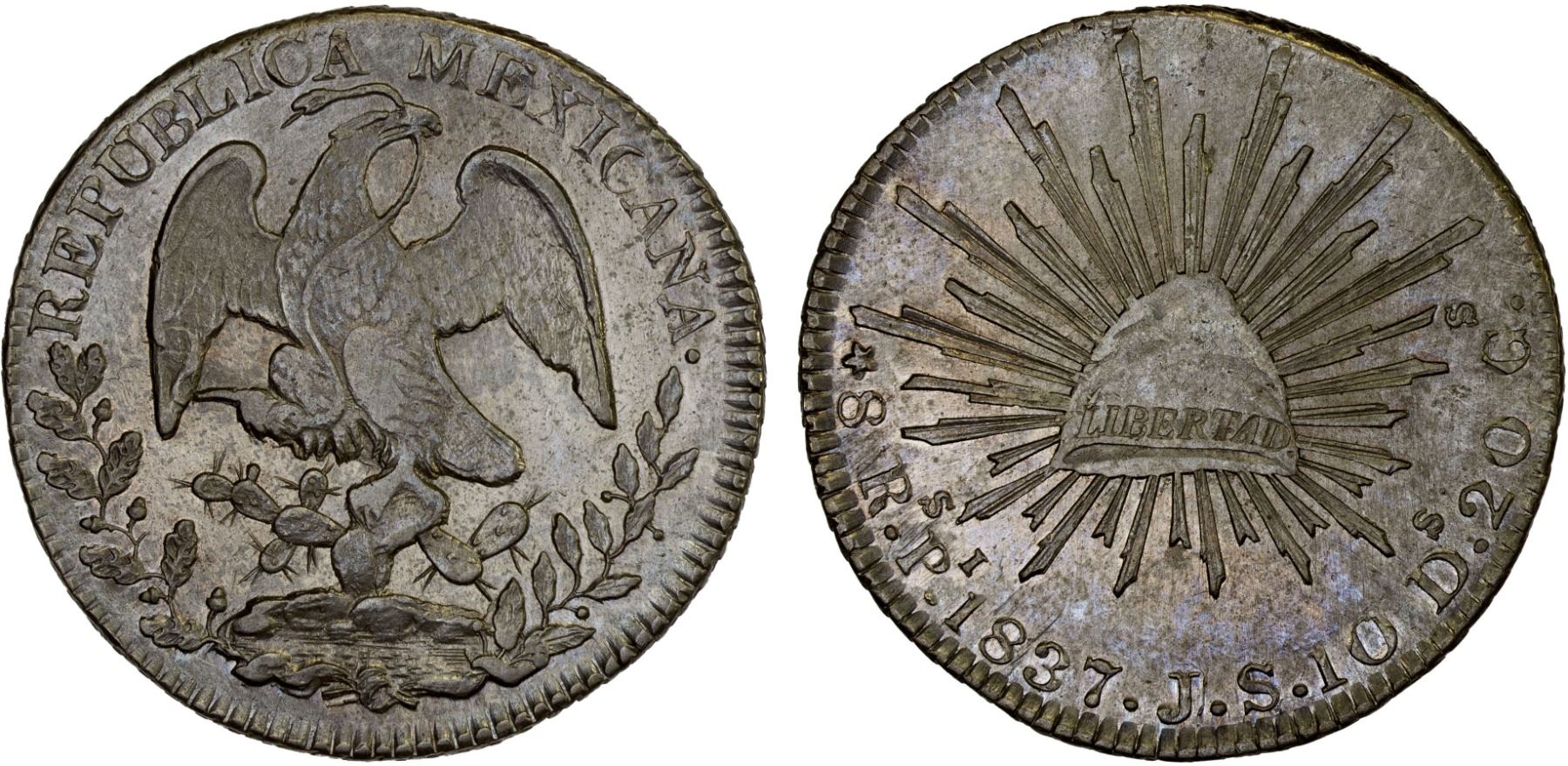 MEXICO: Republic, AR 8 reales (26.96g), San Luis Potosi, 1837-Pi, KM-377.12, D&P-Pi12, assayer JS, J/J on assayer, bobtailed eagle, somewhat scarce date/assayer, medal alignment, elusive in this grade, XF-AU, ex Bob "Swamperbob" Gurney Collection.