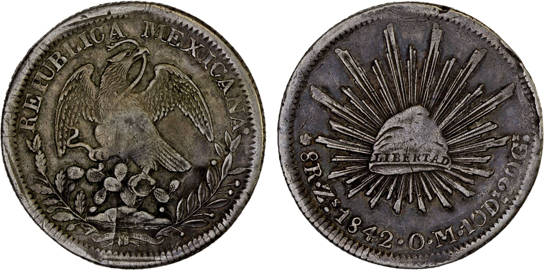 MEXICO: Republic, AR 8 reales (26.96g), Zacatecas, 1842-Zs, KM-377.13, D&P-Zs22, assayer OM, die style of 1825-42 with rounded tail, crude rims, medal alignment, rare variety, F-VF, ex Bob "Swamperbob" Gurney Collection.