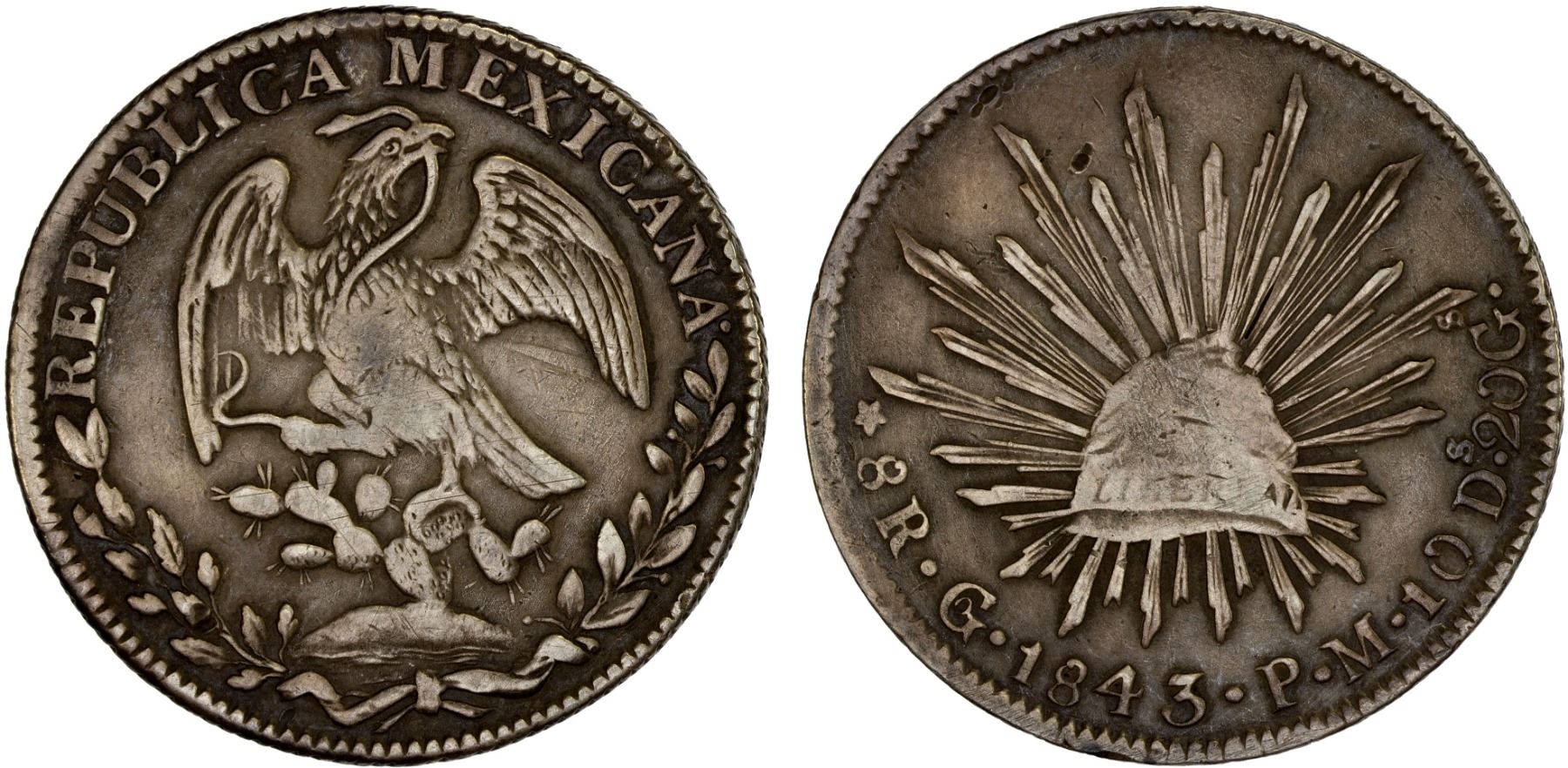 MEXICO: Republic, AR 8 reales (26.97g), 1843-Go, KM-377.8, D&P-Go26, assayer PM, rare mule, with cap side of the 1843-38 style, but the eagle side retaining the 1830-43 style, unknown to D&P, coin rotation, lightly cleaned long ago, has retoned nicely, a few tiny reverse digs, VF, ex Bob "Swamperbob" Gurney Collection.
