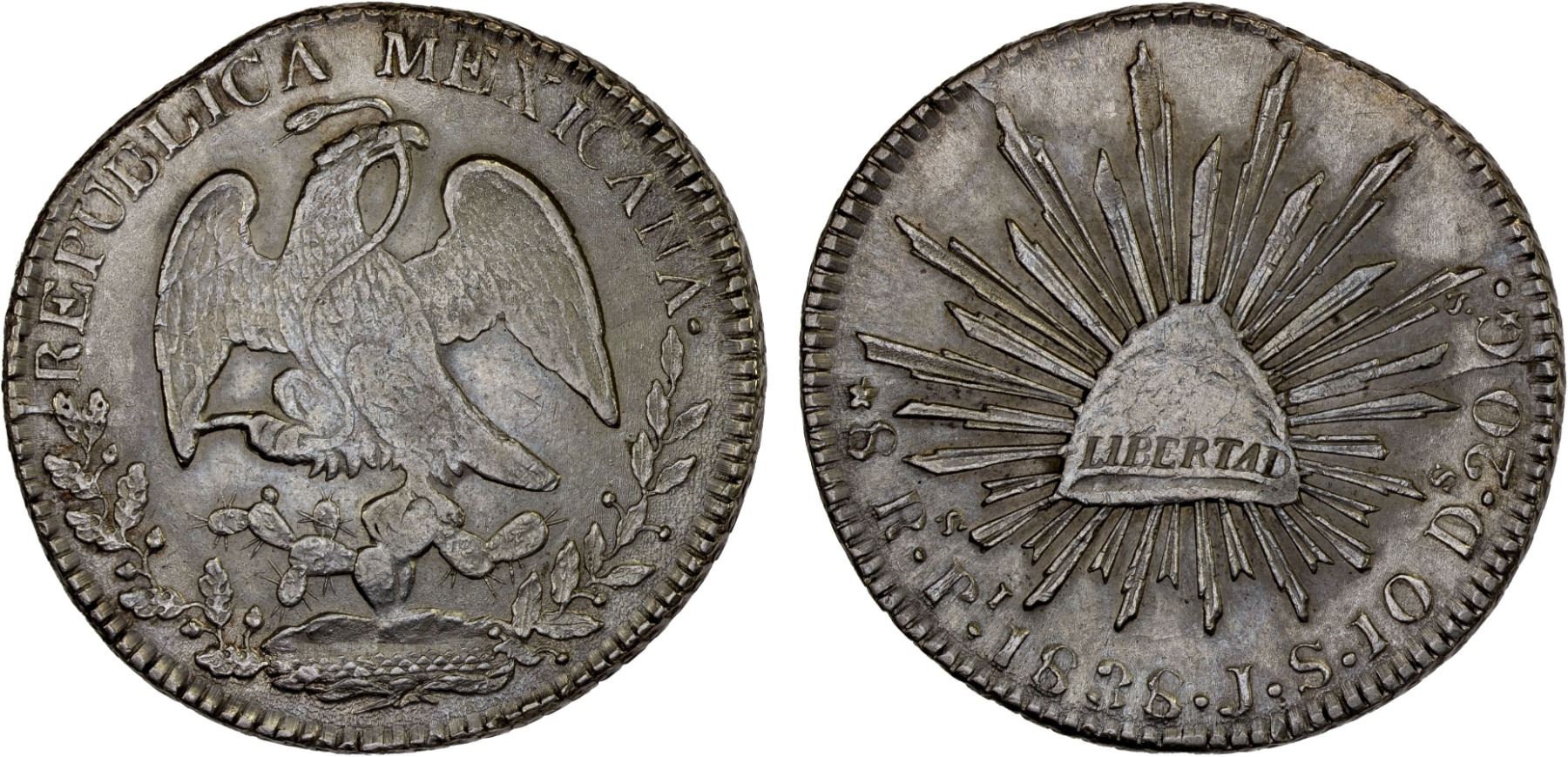 MEXICO: Republic, AR 8 reales (26.97g), San Luis Potosi, 1838-Pi, KM-377.12, D&P-Pi13, assayer JS, long-tailed eagle, tiny clip (edged through), scarce date/assayer, very scarce to rare in this grade, AU, ex Bob "Swamperbob" Gurney Collection.