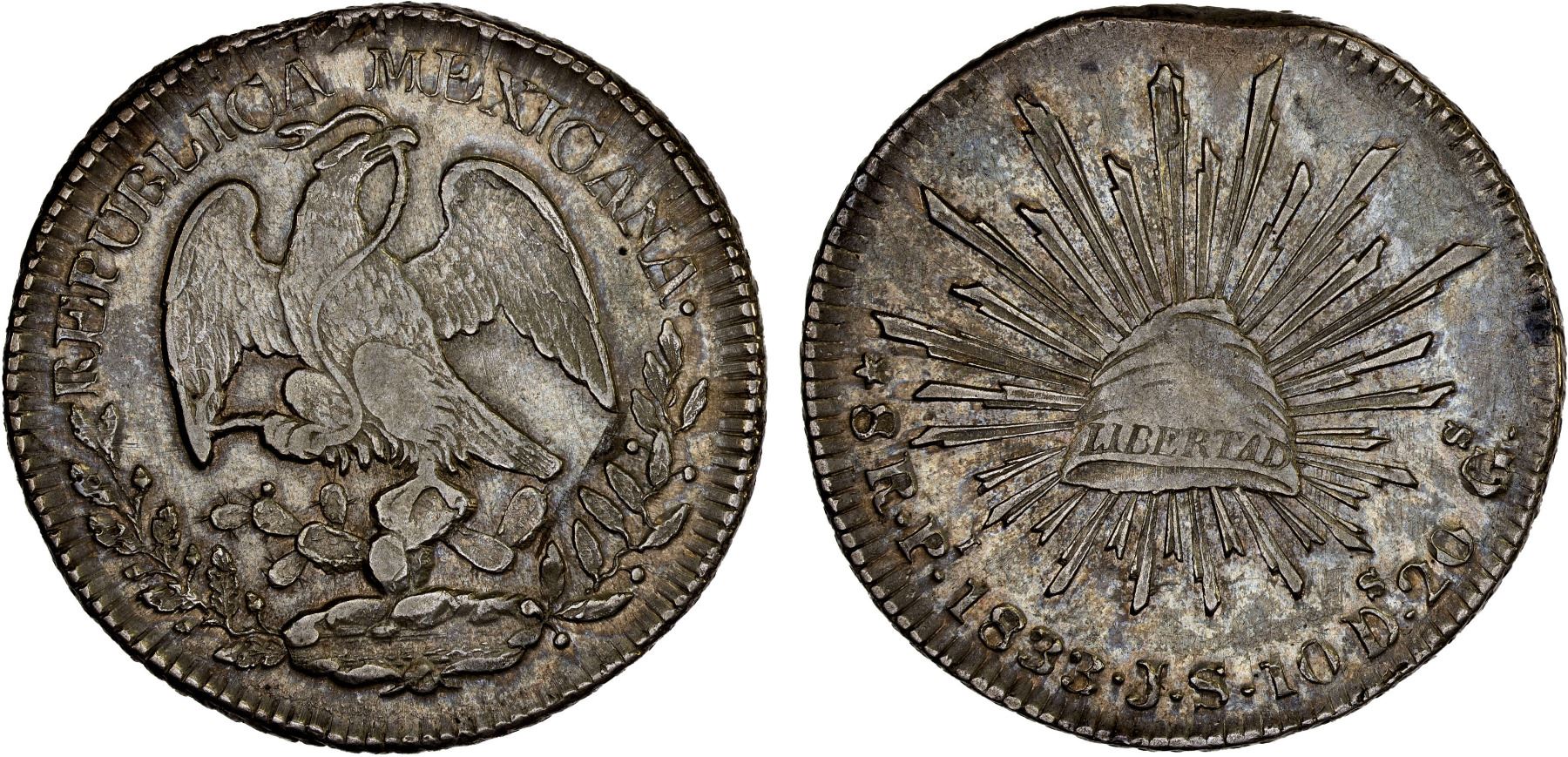 MEXICO: Republic, AR 8 reales (26.98g), San Luis Potosi, 1833-Pi, KM-377.12, D&P-Pi08, assayer JS, small letters, filed area at top of reverse, edge defect at top of obverse, some flattening of eagle, somewhat scarce date/assayer, XF-AU, ex Bob "Swamperbob" Gurney Collection.