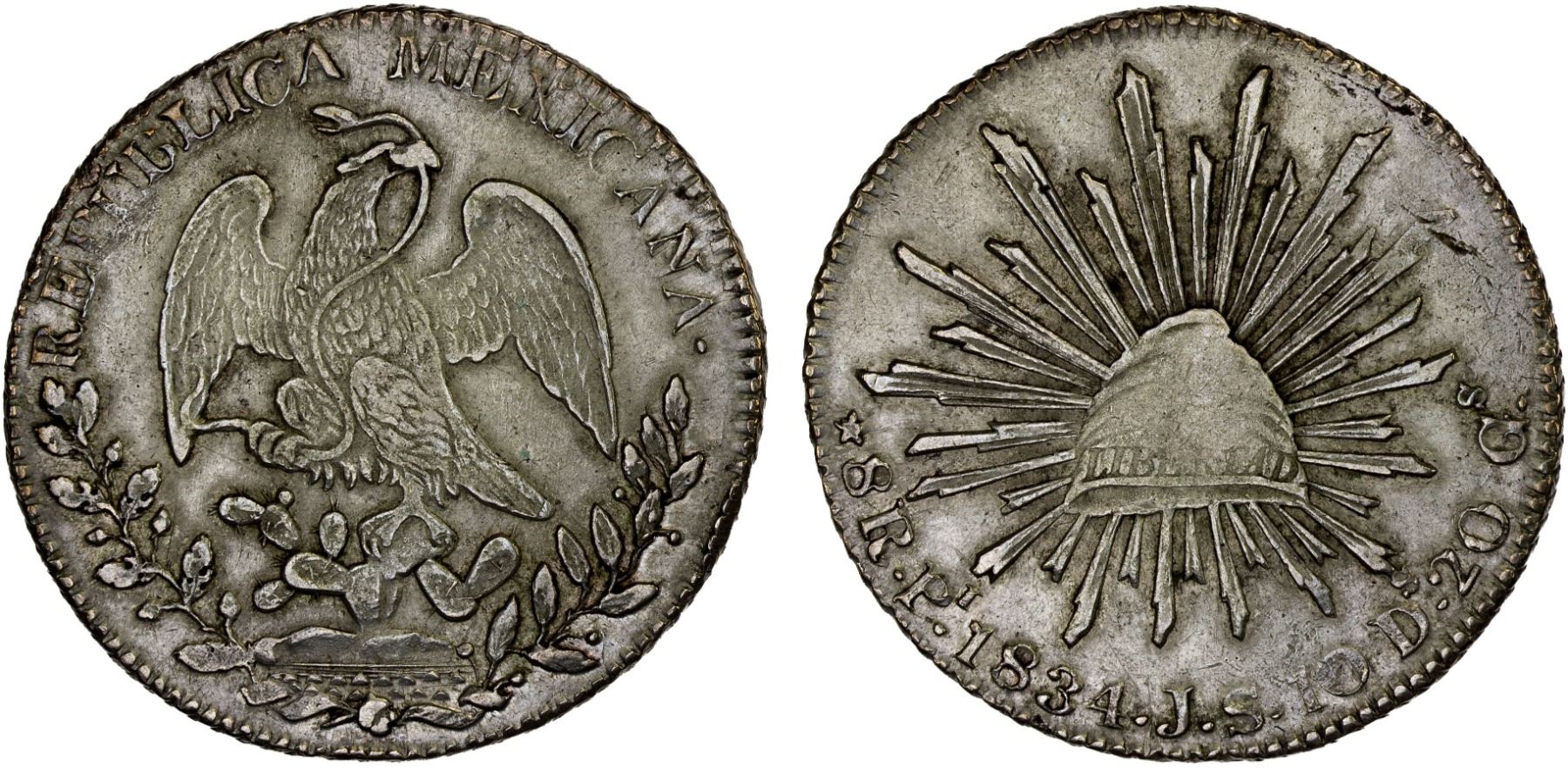 MEXICO: Republic, AR 8 reales (26.98g), San Luis Potosi, 1834-Pi, KM-377.12, D&P-Pi09, assayer JS, broken beak eagle (beak repaired, rare variant), somewhat scarce date/assayer, XF, ex Bob "Swamperbob" Gurney Collection.