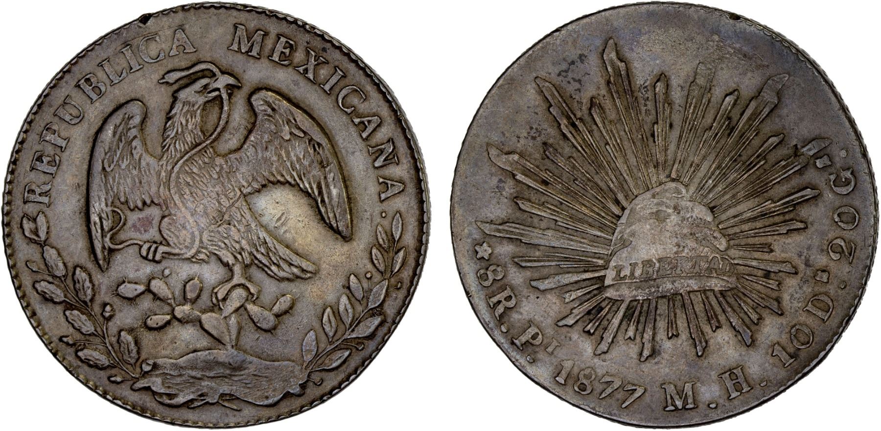 MEXICO: Republic, AR 8 reales (26.99g), 1877-Pi, KM-377.12, assayer MH, tiny obverse rim nick and dig, circular lathe marks on obverse die, light tone, XF, ex Bob "Swamperbob" Gurney Collection.