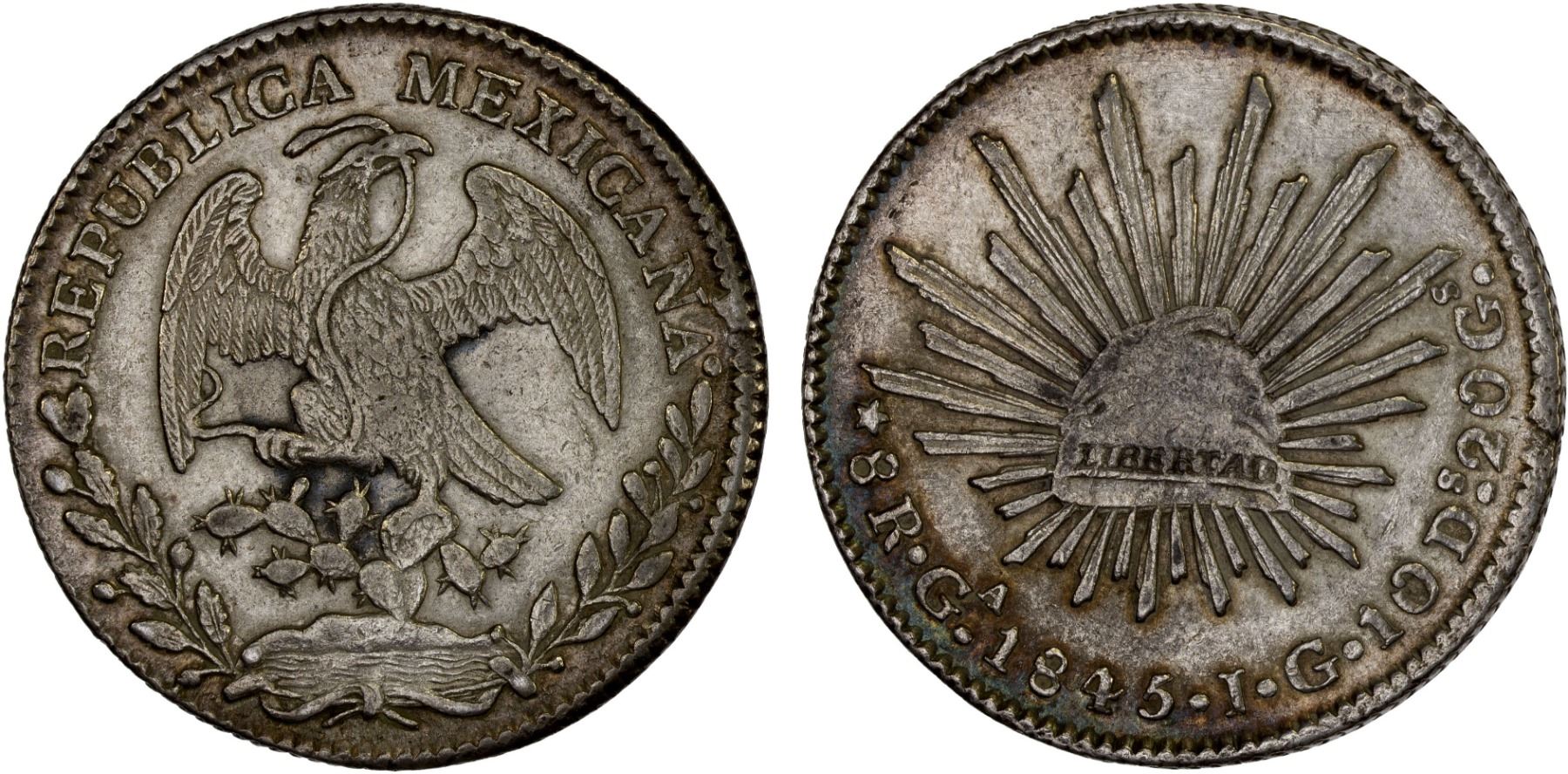 MEXICO: Republic, AR 8 reales (26.99g), Guadalajara, 1845-Ga, KM-377.6, D&P-Ga27, assayer JG, lightly cleaned, rare to very rare date/assayer, very few survive this nice, XF, ex Bob "Swamperbob" Gurney Collection.