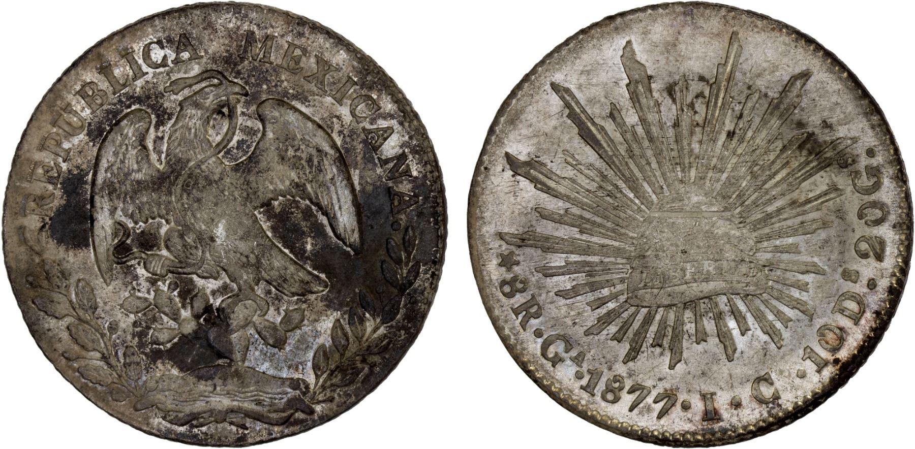 MEXICO: Republic, AR 8 reales (27.02g), 1877-Ga, KM-377.6, assayer IC, deep uneven tone on obverse, AU, ex Bob "Swamperbob" Gurney Collection.