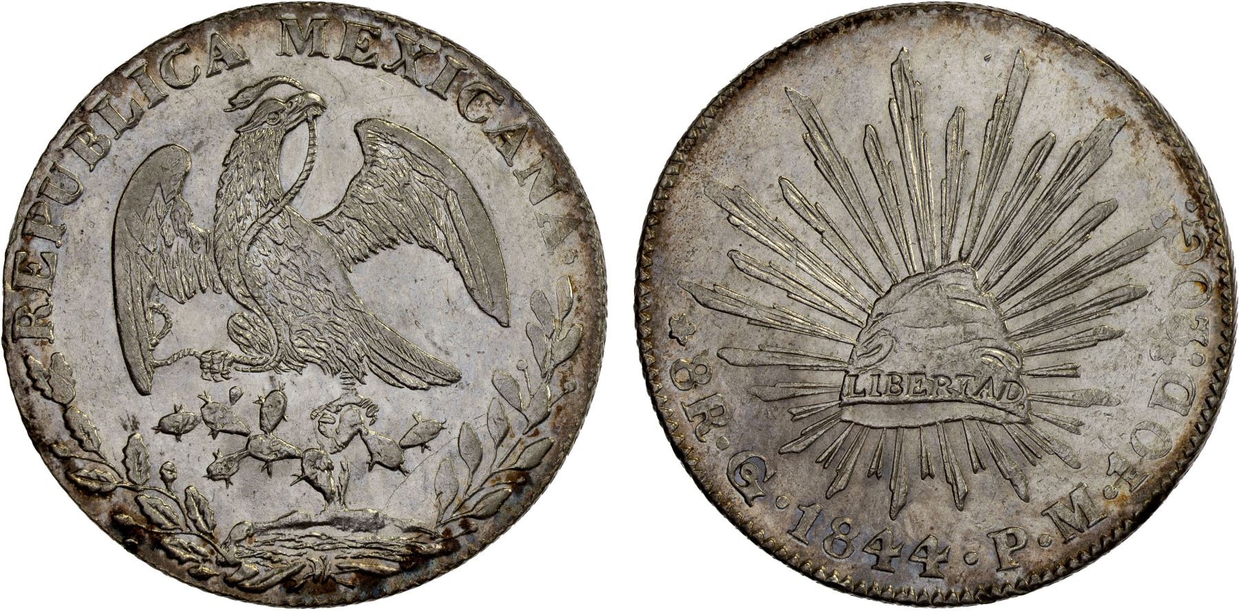 MEXICO: Republic, AR 8 reales (27.02g), Guanajuato, 1844-Go, KM-377.8, D&P-Go27, assayer PM, eagle #4 (short beak, type of 1845), cap #3 (center ray), snake #2 (open mouth with tongue), lightly cleaned, starting to retone peripherally, still lustrous and attractive, AU, ex Bob "Swamperbob" Gurney Collection.