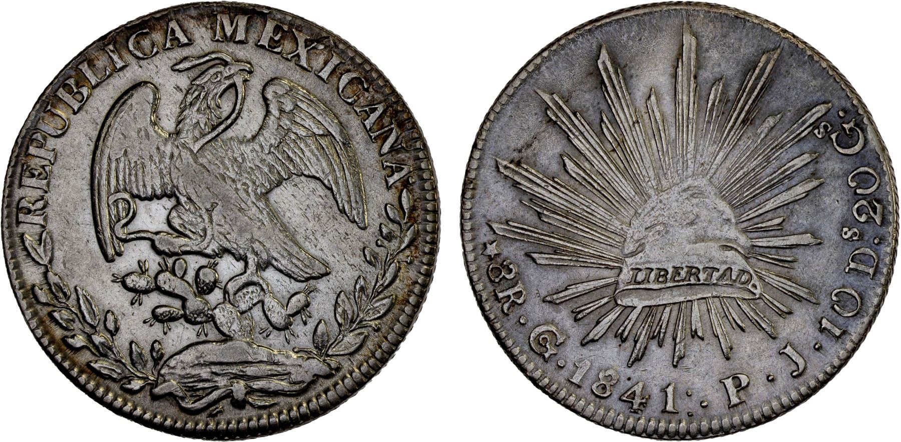 MEXICO: Republic, AR 8 reales (27.03g), Guanajuato, 1841-Go, KM-377.8, D&P-Go23, assayer PJ, several numbers and letters double-punched in date legend, perhaps lightly cleaned, VF-XF, ex Bob "Swamperbob" Gurney Collection.