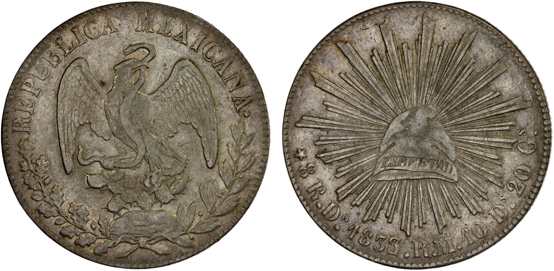 MEXICO: Republic, AR 8 reales (27.04g), 1833/2-Do, KM-377.4, D&P-Do10, assayer RM/L, clear overdate, diecracks on both sides, some luster, a bit scarce, VF-XF, ex Bob "Swamperbob" Gurney Collection.