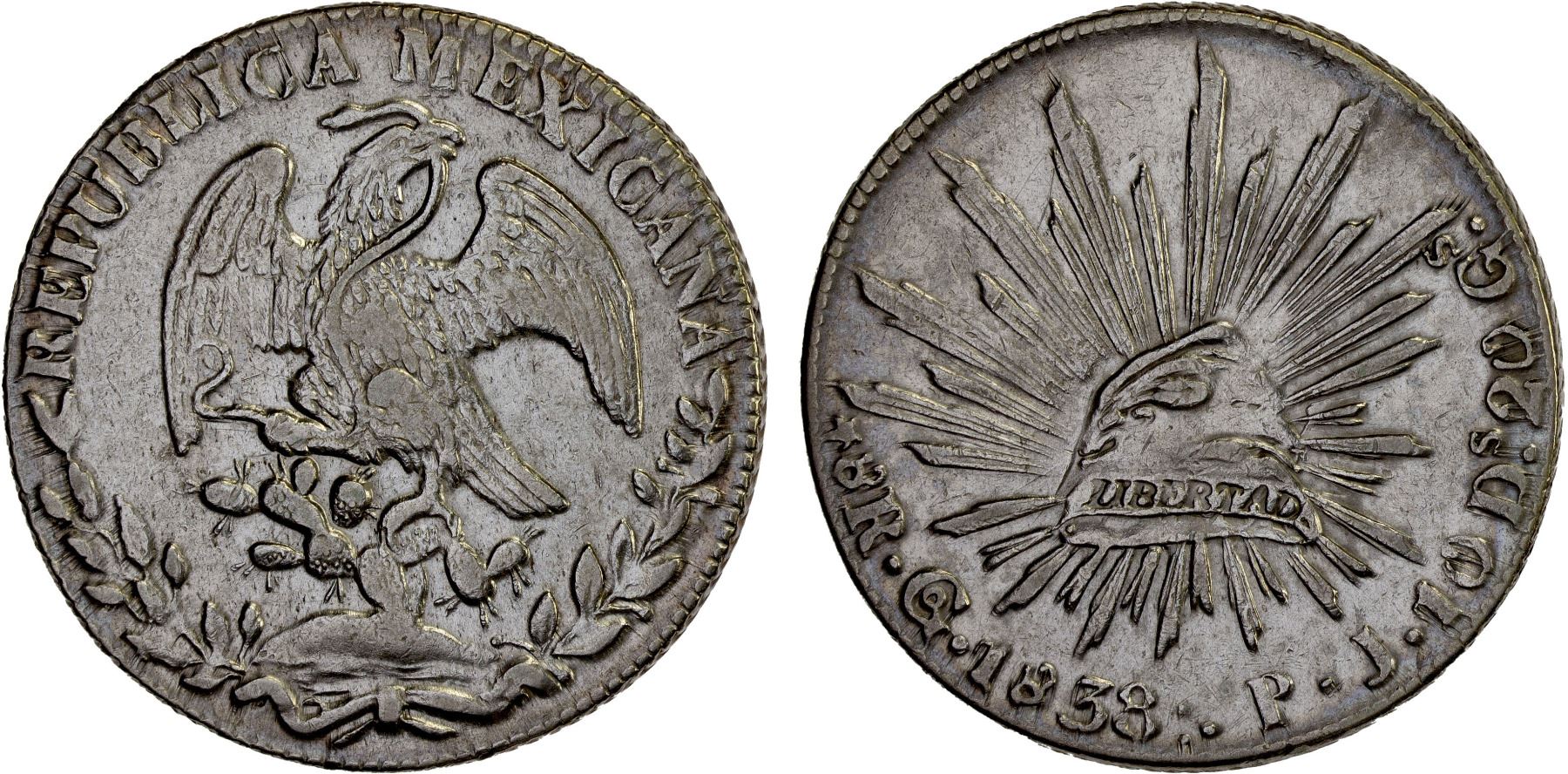 MEXICO: Republic, AR 8 reales (27.08g), Guanajuato, 1838-Go, KM-377.8, D&P-Go20, assayer PJ, perhaps lightly cleaned, well struck, XF, ex Bob "Swamperbob" Gurney Collection.