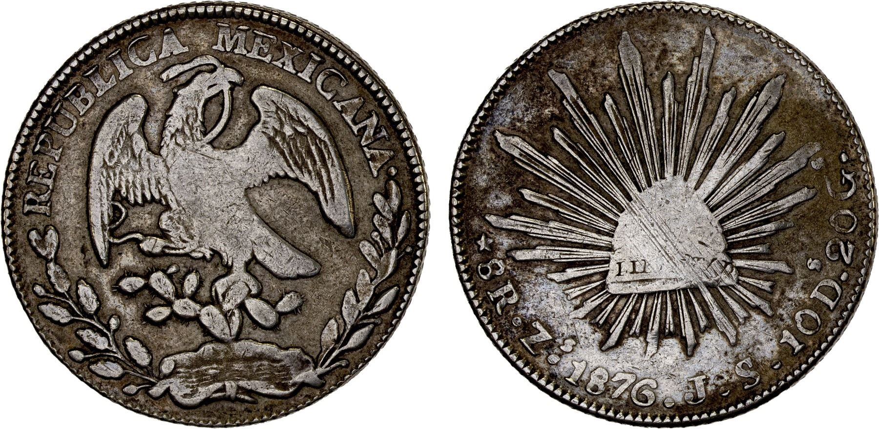 MEXICO: Republic, AR 8 reales (27.09g), 1876-Zs, KM-377.13, assayer JS, weak centers, as are most of this scarce date/mintmark/assayer, flan striations on cap, VF, ex Bob "Swamperbob" Gurney Collection.