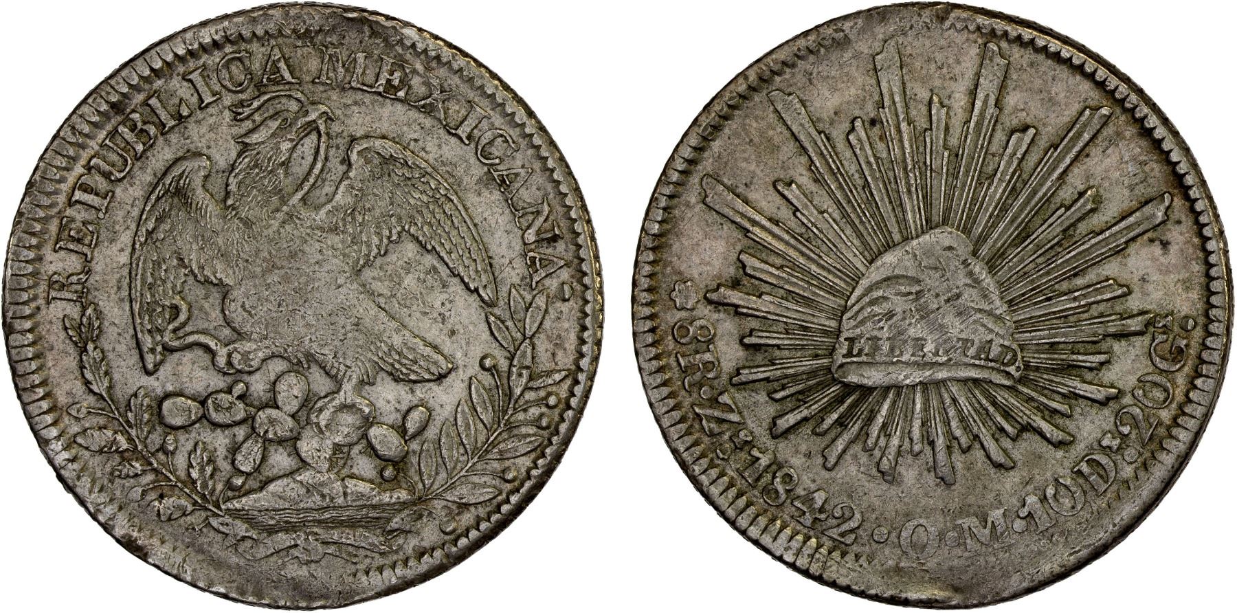 MEXICO: Republic, AR 8 reales (27.10g), Zacatecas, 1842-Zs, KM-377.13, D&P-Zs22, assayer OM, die style of 1825-42 with rounded tail, somewhat irregular flan, some adjustment marks on cap, soft eagle center, medal alignment, rare variety, XF, ex Bob "Swamperbob" Gurney Collection.