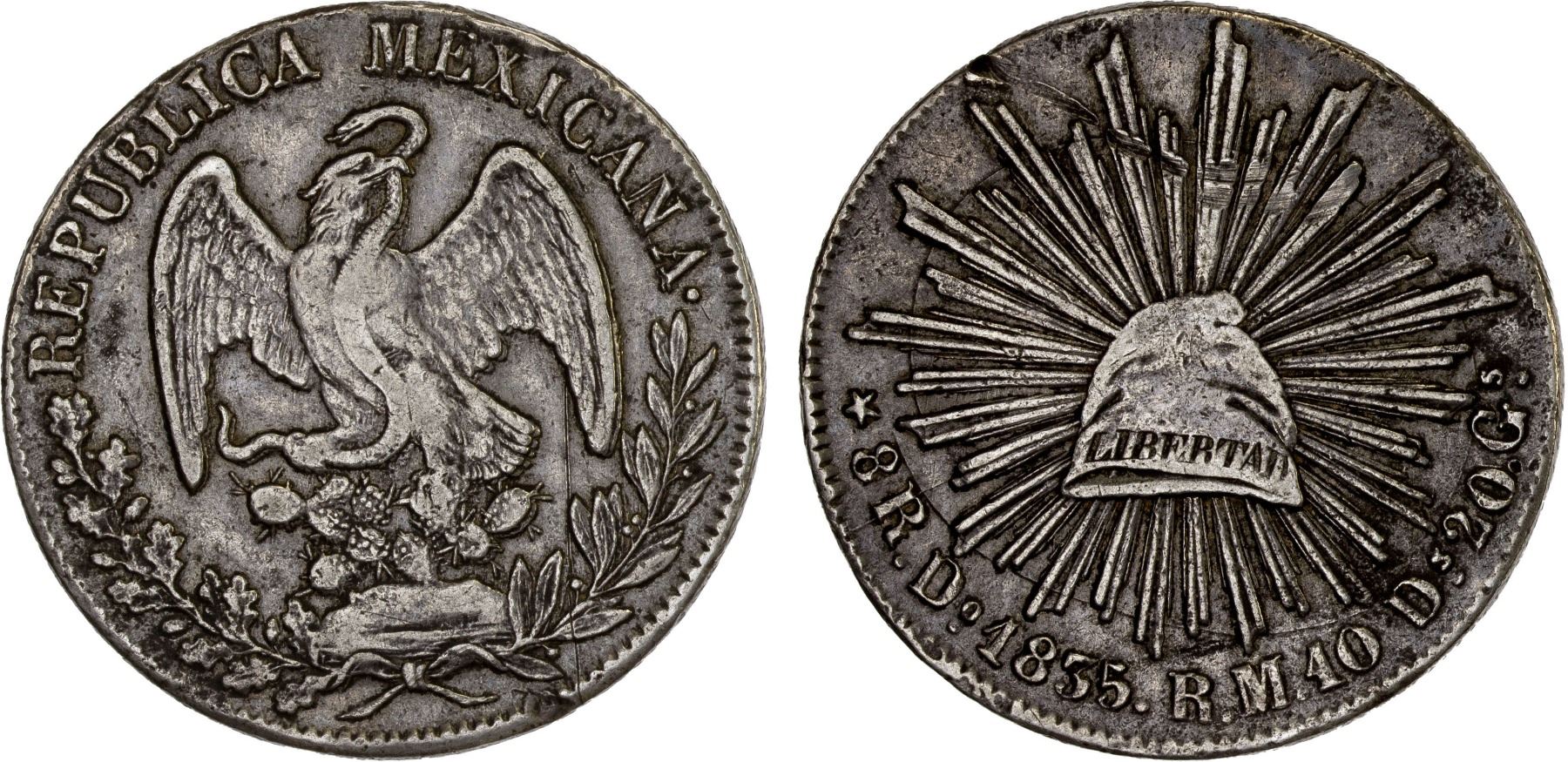 MEXICO: Republic, AR 8 reales (27.14g), 1835-Do, KM-377.4, D&P-Do12, assayer RM, crested raptor, obverse scratch, scrape on upper reverse, rim nick at 5:30 on obverse, somewhat scarce, VF, ex Bob "Swamperbob" Gurney Collection.