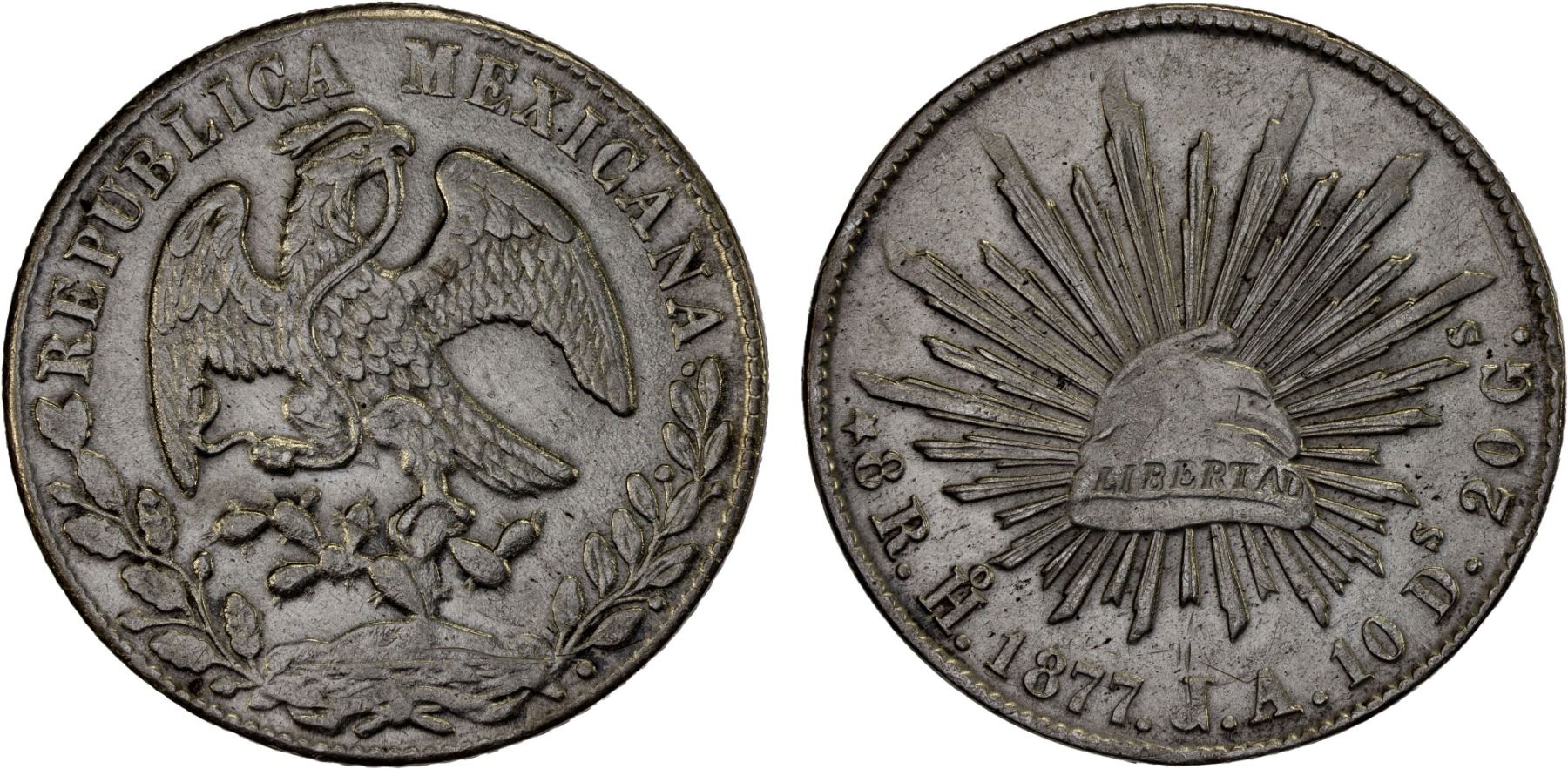 MEXICO: Republic, AR 8 reales (27.14g), 1877-Ho, KM-377.9, assayer JA, lightly cleaned, scarce and underrated date/mintmark/assayer, XF, ex Bob "Swamperbob" Gurney Collection.