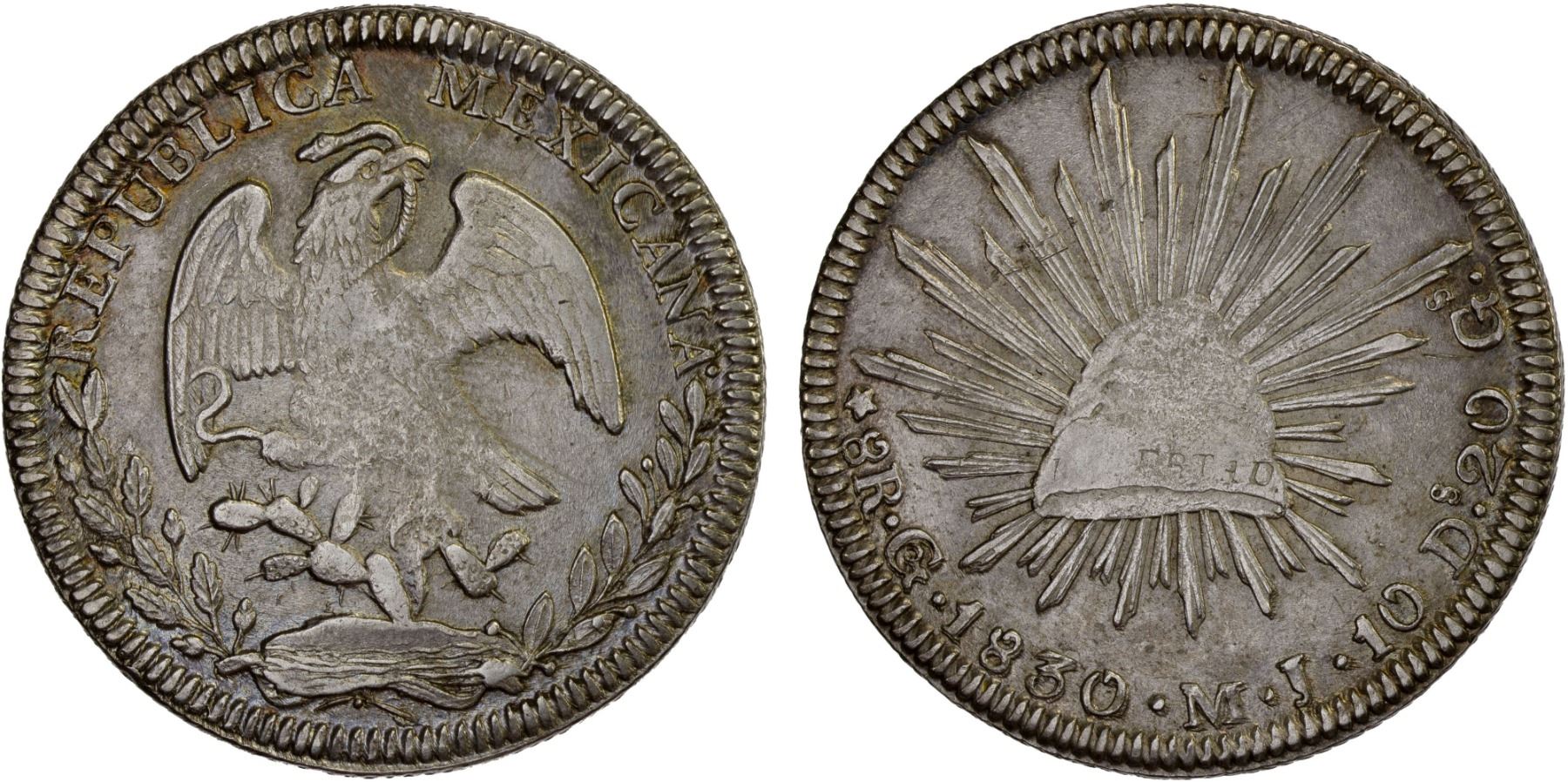 MEXICO: Republic, AR 8 reales (27.16g), 1829-Go, KM-377.8, D&P-Go11, assayer MJ, die style of 1829-30, doubled die reverse, a few small reverse scratches, somewhat soft centers, better grade than usually encountered, very light attractive tone, XF-AU, ex Bob "Swamperbob" Gurney Collection.