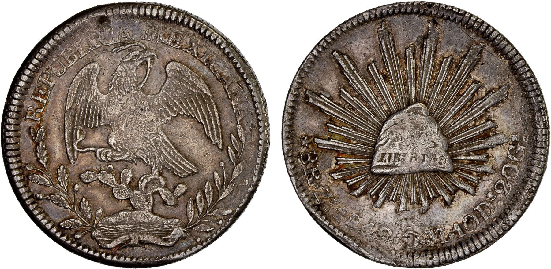 MEXICO: Republic, AR 8 reales (27.16g), Zacatecas, 1842-Zs, KM-377.13, D&P-Zs22, assayer OM, die style of 1842-45 with square tail, somewhat uneven strike due to variable flan thickness (end of strip), VF-XF, ex Bob "Swamperbob" Gurney Collection.