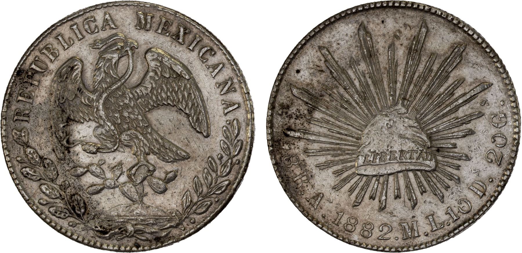 MEXICO: Republic, AR 8 reales (27.21g), 1882-As, KM-377.1, assayer ML, die style of 1877-82, with texture and ridging on eagle, lightly cleaned, VF-XF, ex Bob "Swamperbob" Gurney Collection.