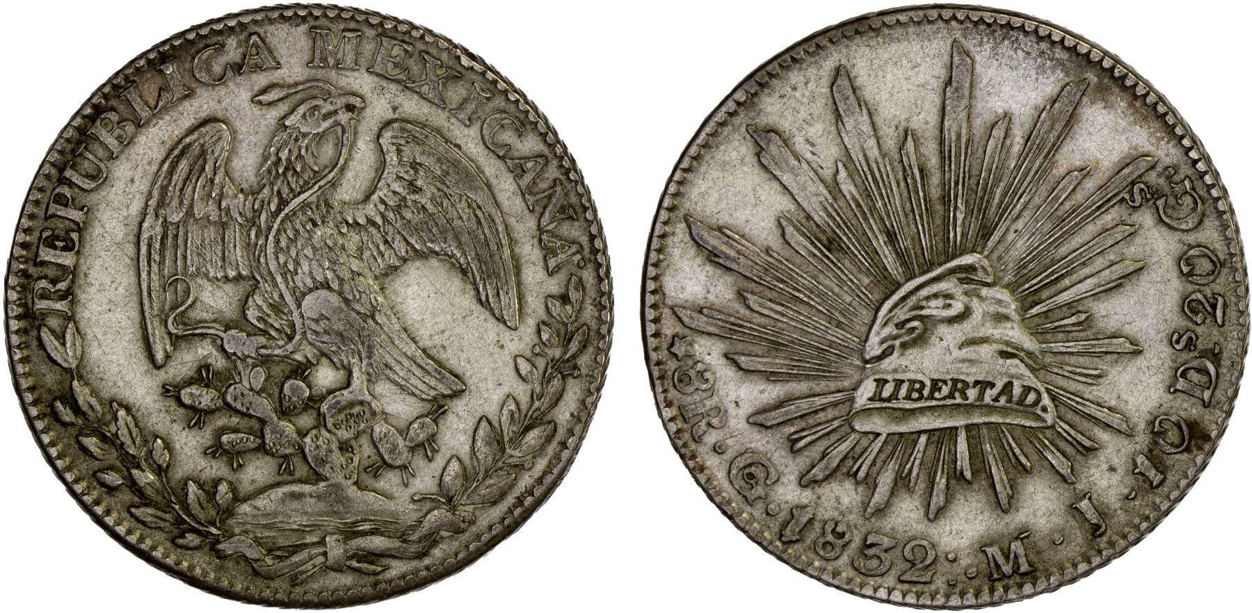MEXICO: Republic, AR 8 reales (27.22g), 1832-Go, KM-377.8, D&P-Go13, assayer MJ, variety with 1 over inverted 1 in date, 10/0 and Gs/s in reverse legend, edge reverses direction, very scarce variety, VF-XF, ex Bob "Swamperbob" Gurney Collection. The only example of this variety on CoinArchives is the host of a Philippine countermarked piece.