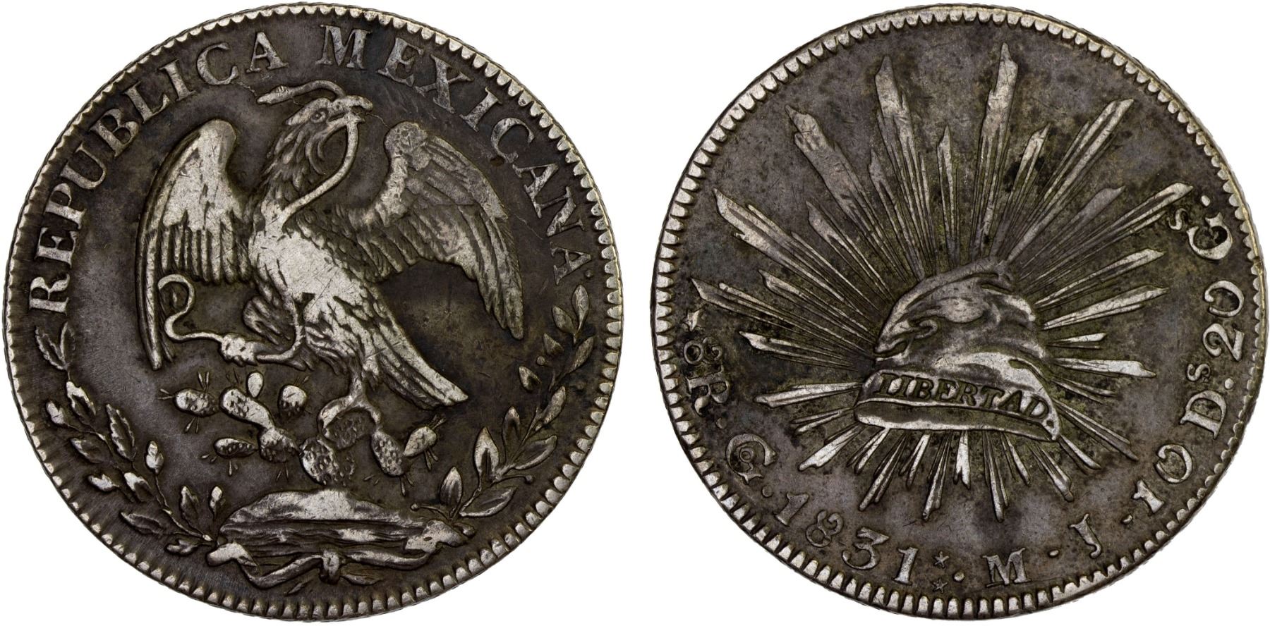 MEXICO: Republic, AR 8 reales (27.24g), 1831-Go, KM-377.8, D&P-Go12, assayer MJ, variety with straight J, two stars and 1 period after date, deeply toned, standard 32-ray matrix, scarce and popular variety, Choice VF, ex Bob "Swamperbob" Gurney Collection. It has been suggested that the two stars might indicate a Masonic connection.