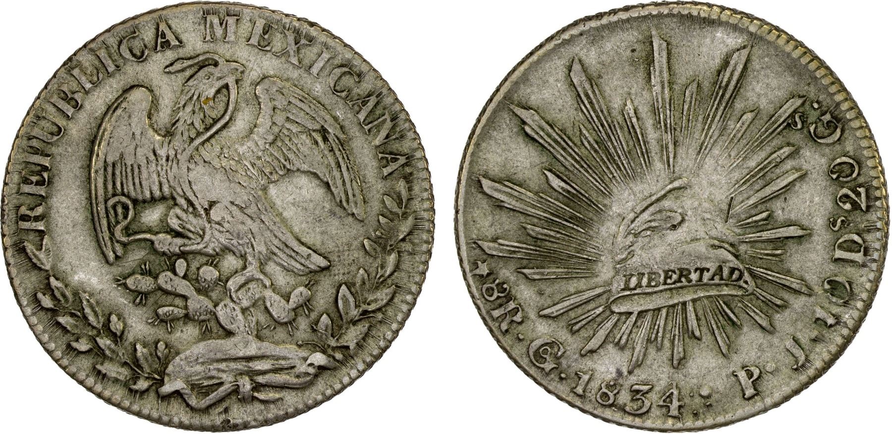 MEXICO: Republic, AR 8 reales (27.31g), 1834-Go, KM-377.8, D&P-Go16, assayer PJ, 4 dots after 4, engraved 4/4, tiny reverse scratch, VF-XF, ex Bob "Swamperbob" Gurney Collection.