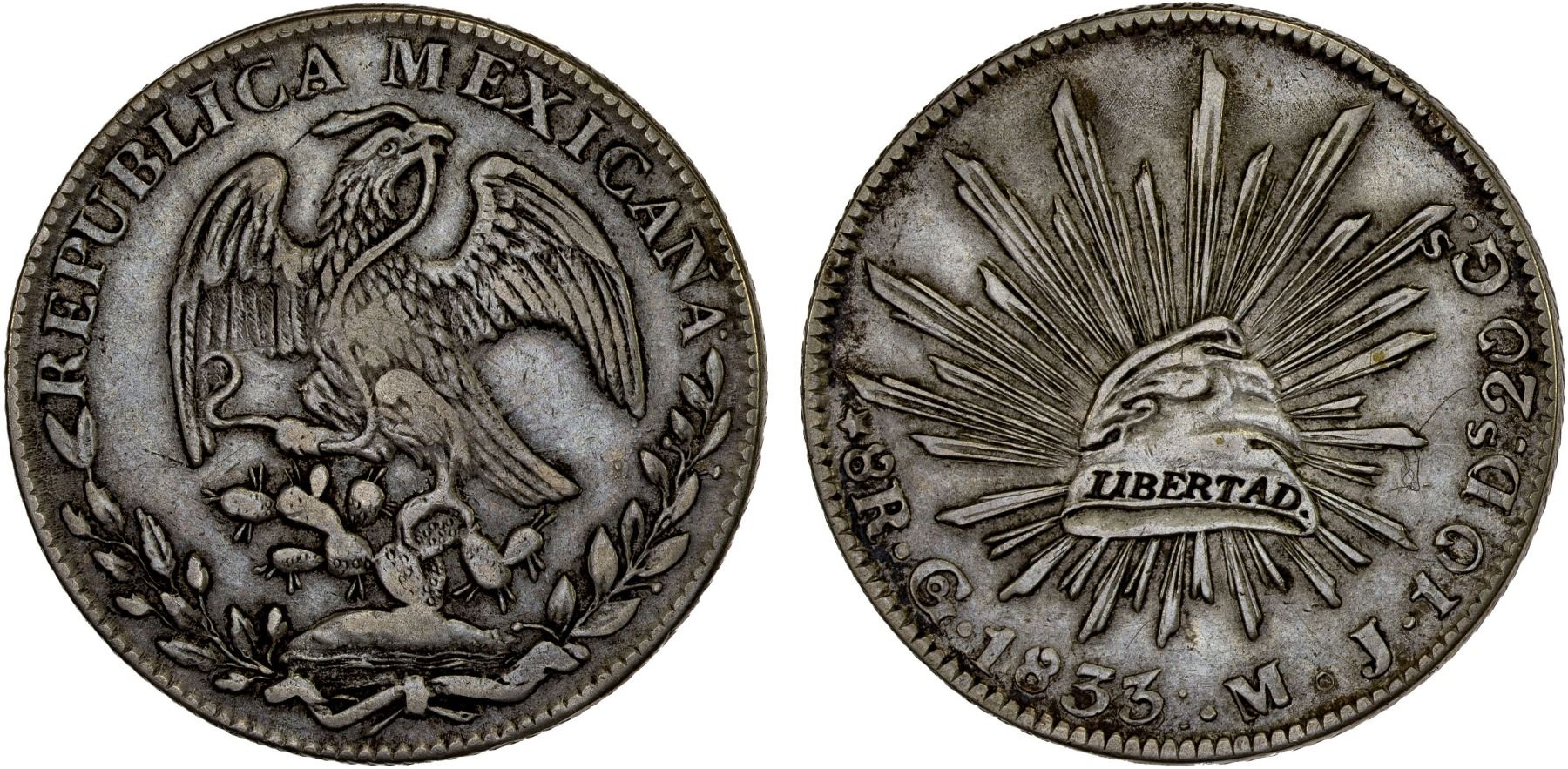 MEXICO: Republic, AR 8 reales (27.47g), 1833-Go, KM-377.8, D&P-Go14, assayer MJ, tilted second 3 in date, full J, hollow stop between assayer's initials, both 3's in date repunched, odd tilted M initial, heavy, lightly cleaned, scarcer than the straight J variety, Choice VF, ex Bob "Swamperbob" Gurney Collection.