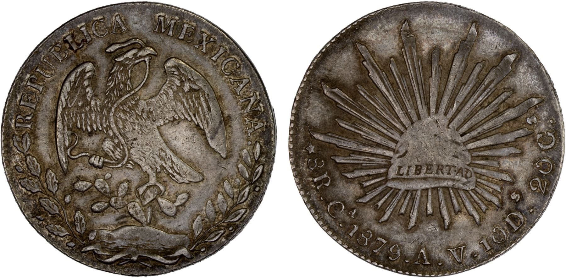 MEXICO: Republic, AR 8 reales (27.49g), 1879-Ca, KM-377.2, assayer AV, "normal" 9 variety per D&P, toned, VF-XF, ex Bob "Swamperbob" Gurney Collection.