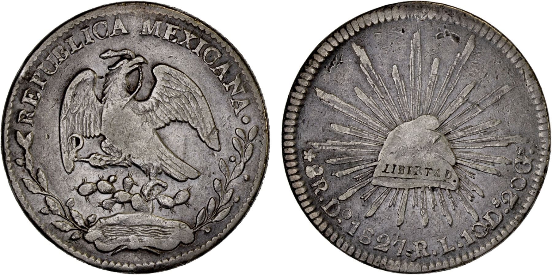 MEXICO: Republic, AR 8 reales (27.69g), Durango, 1827-Do, KM-377.4, D&P-Do04, assayer RL, 32 rays, cactus pad pattern 6/3/2, die style of 1827-29, much scarcer than the earlier die style, reverse contact marks, scarce date/assayer, F-VF, ex Bob "Swamperbob" Gurney Collection.