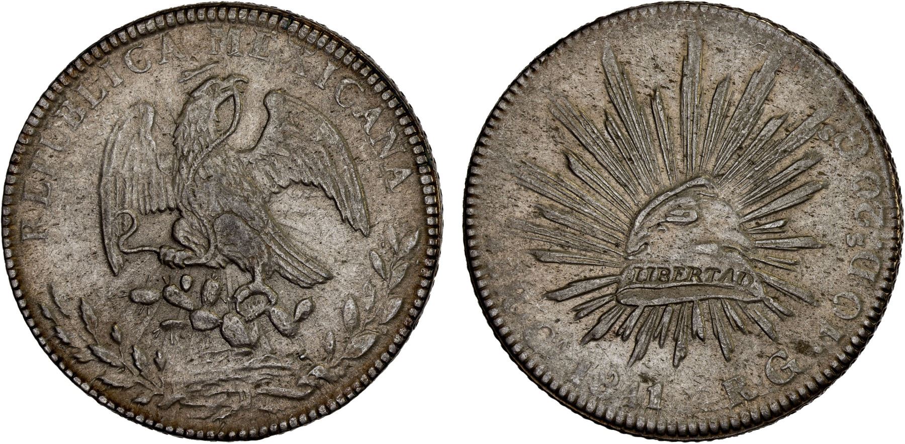 MEXICO: Republic, AR 8 reales (27.87g), Chihuahua, 1841-Ca, KM-377.2, D&P-Ca12, assayer RG, somewhat grainy appearance, somewhat weak margins, subvariety with sunburst die clash on eagle side, very scarce date/assayer, VF-XF, ex Bob "Swamperbob" Gurney Collection.