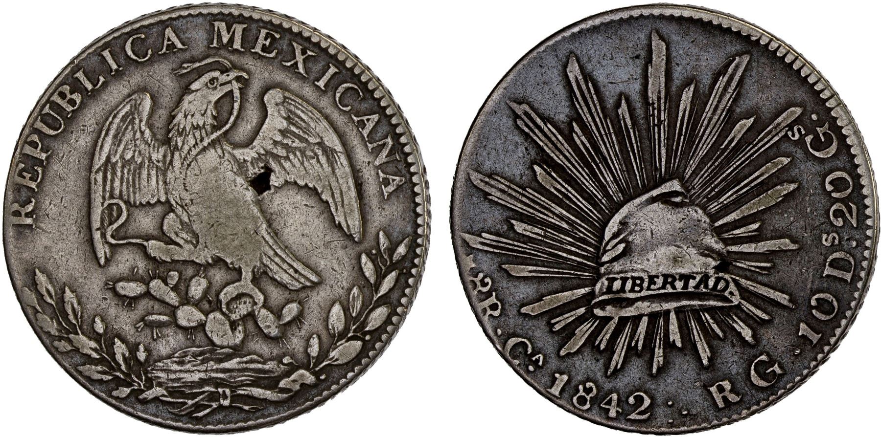 MEXICO: Republic, AR 8 reales (28.69g), Chihuahua, 1842-Ca, KM-377.2, D&P-Ca13, assayer RG, flan defect, overweight, scarce date/assayer, F-VF, ex Bob "Swamperbob" Gurney Collection.