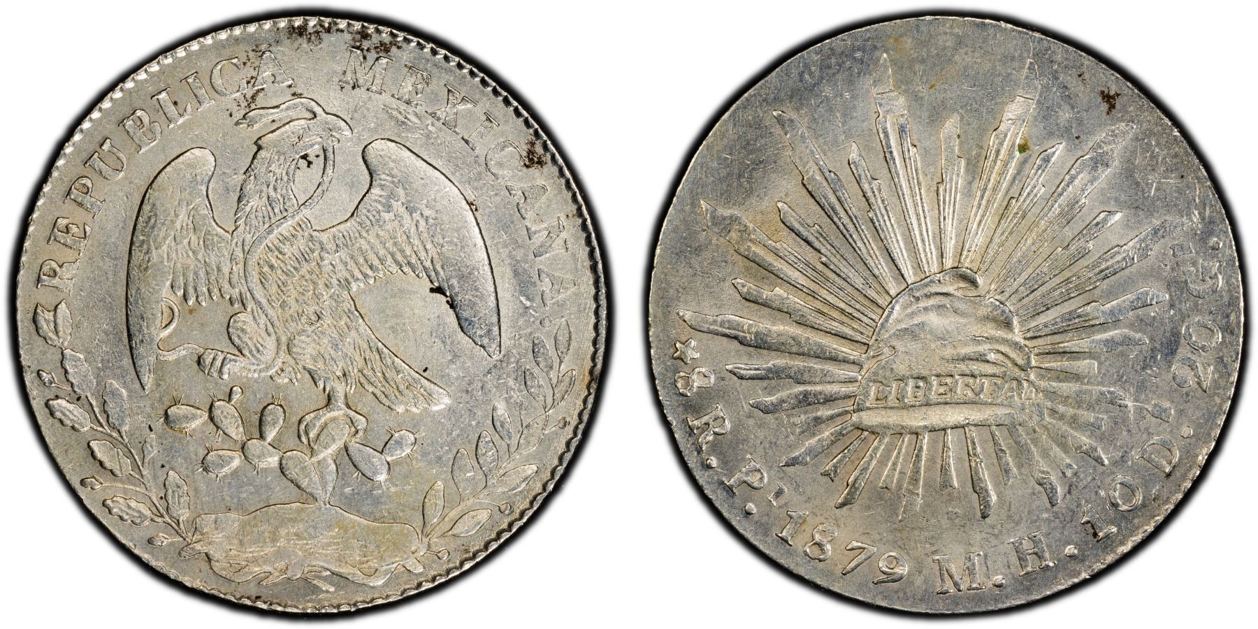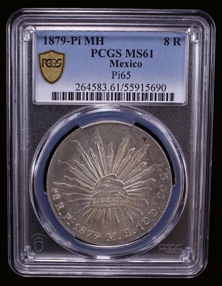 MEXICO: Republic, AR 8 reales, San Luís Potosí, 1879-Pi, KM-377.12, DP-Pi65, assayer MH, a bright lustrous example, PCGS graded MS61, ex Bob "Swamperbob" Gurney Collection. Tied with one other example for highest graded (Top Pop) at PCGS.