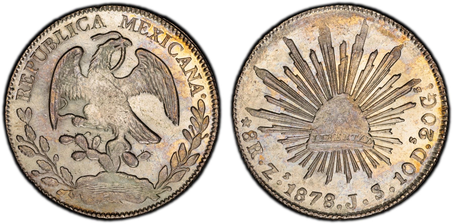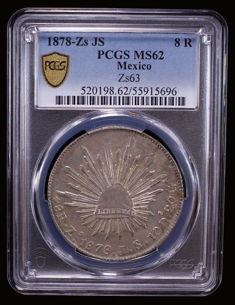 MEXICO: Republic, AR 8 reales, Zacatecas, 1878-Zs, KM-377.13, DP-Zs63, assayer JS, a superb lustrous example, PCGS graded MS62, ex Bob "Swamperbob" Gurney Collection.