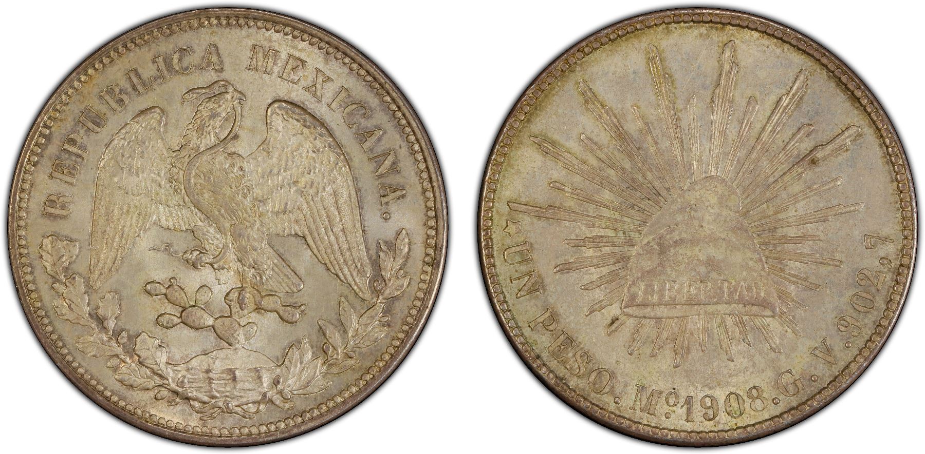 MEXICO: Republic, AR peso, 1908-Mo, KM-409.2, assayer GV, a lovely mint state example! PCGS graded MS63.