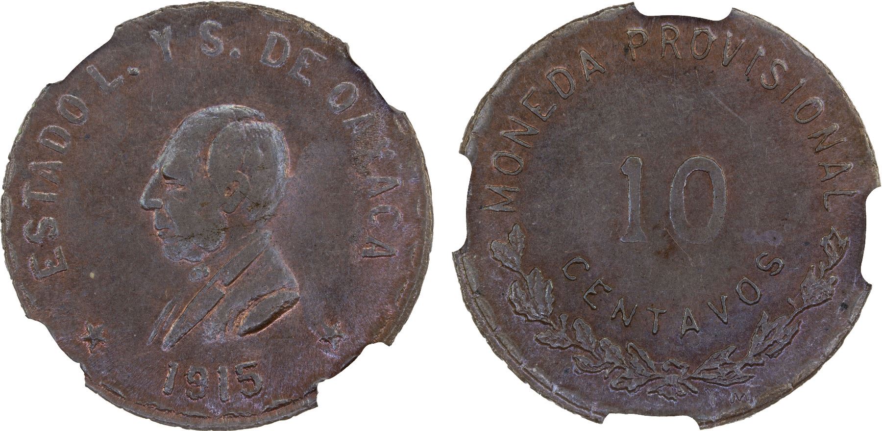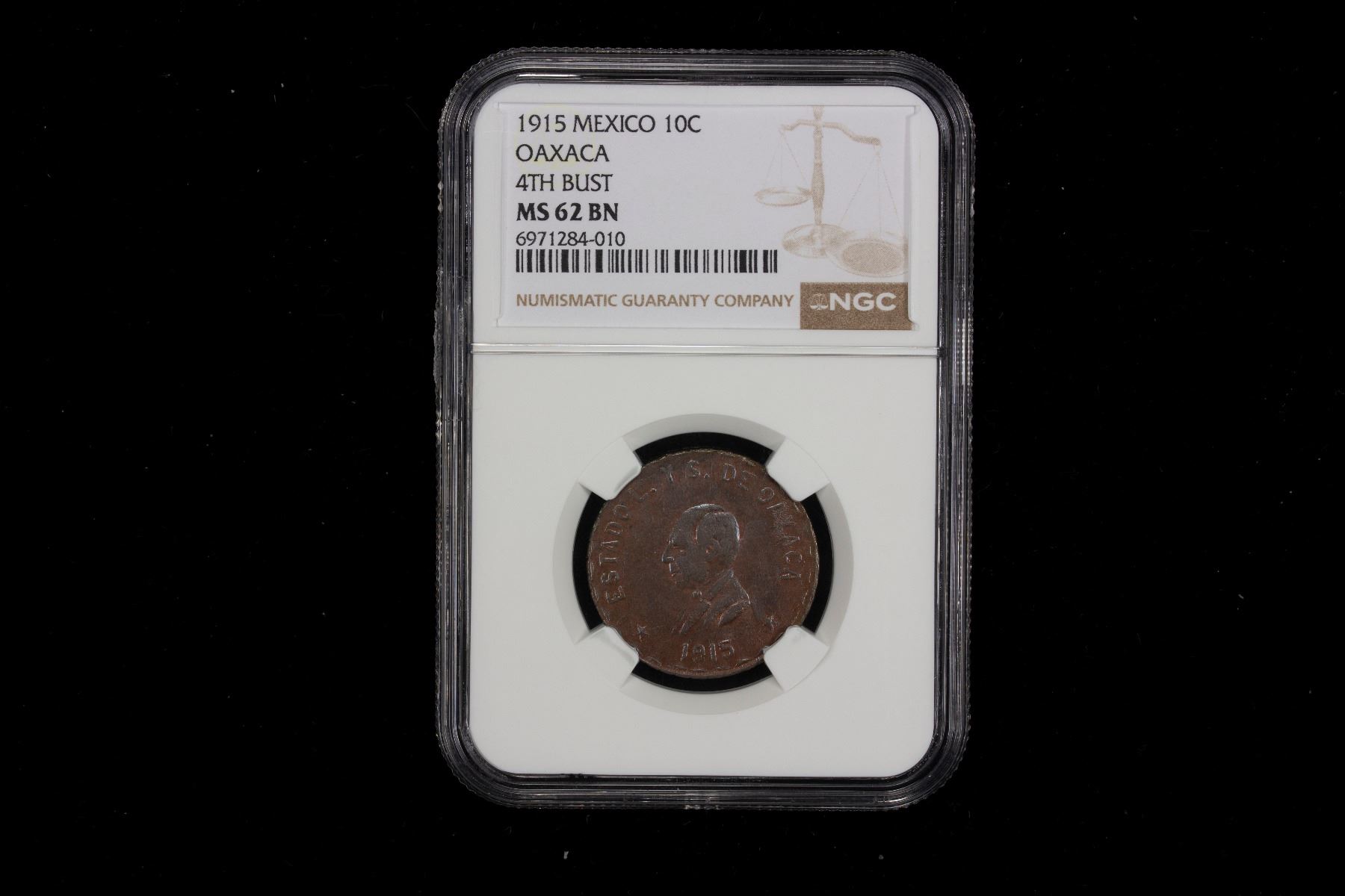 MEXICO: Revolutionary Issue, AE 10 centavos, Oaxaca, 1915, KM-729, Provisional Government issue, assayer TM, 4th bust, variety with long pointed truncation, a pleasing mint state example, NGC graded MS62 BN. The initials "TM" found on some 1915 Oaxaca coins stand for Teofilo Monroy, who was appointed as the Director of the Oaxaca Mint during that time. He, along with John De Coe, the Chief Engraver, played a significant role in the operation of the mint during the Mexican Revolution.