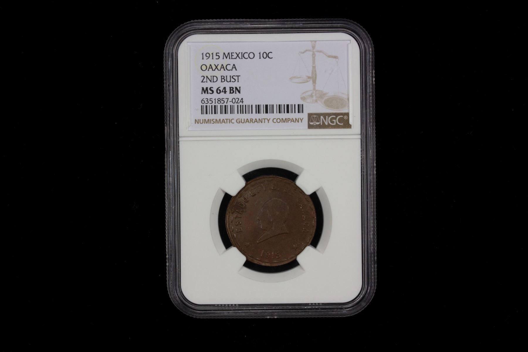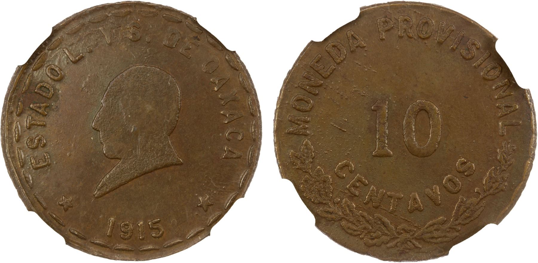 MEXICO: Revolutionary Issue, AE 10 centavos, Oaxaca, 1915, KM-722, Provisional Government issue, 2nd bust, variety with long pointed truncation, a wonderful mint state example! NGC graded MS64 BN.